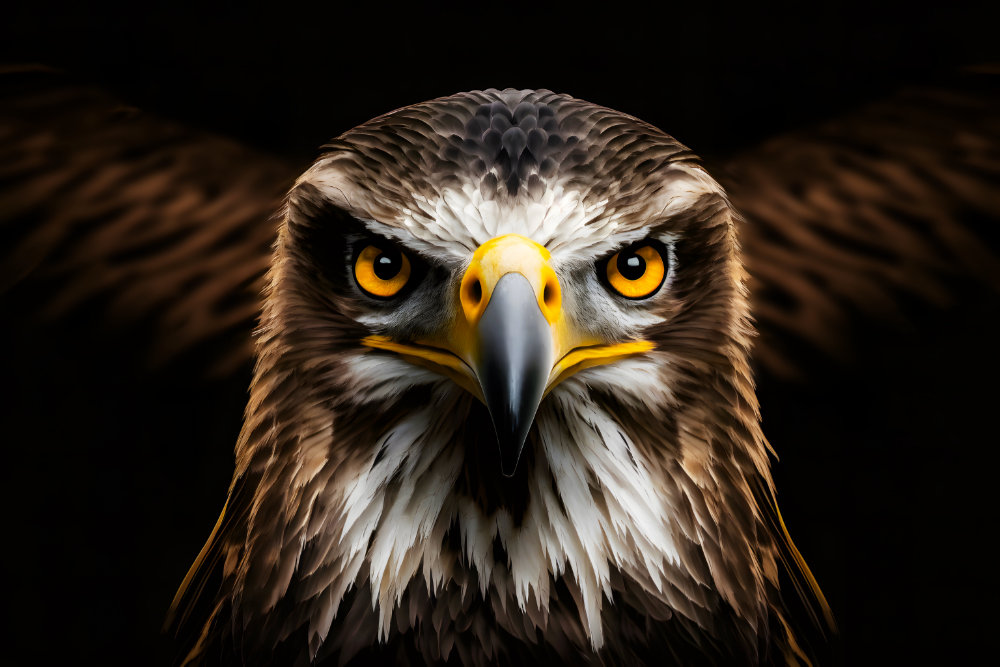 Erleben Sie die majestätische Schönheit des Wandbilds Adler von Sabine Schiebofski und holen Sie sich ein eindrucksvolles Kunstwerk in Ihr Zuhause! Das hochwertige Portrait des Adlerkopfs auf schwarzem Hintergrund zeigt den stolzen Vogel mit seinem durchdringenden Blick und seinen mächtigen Flügeln im Hintergrund.