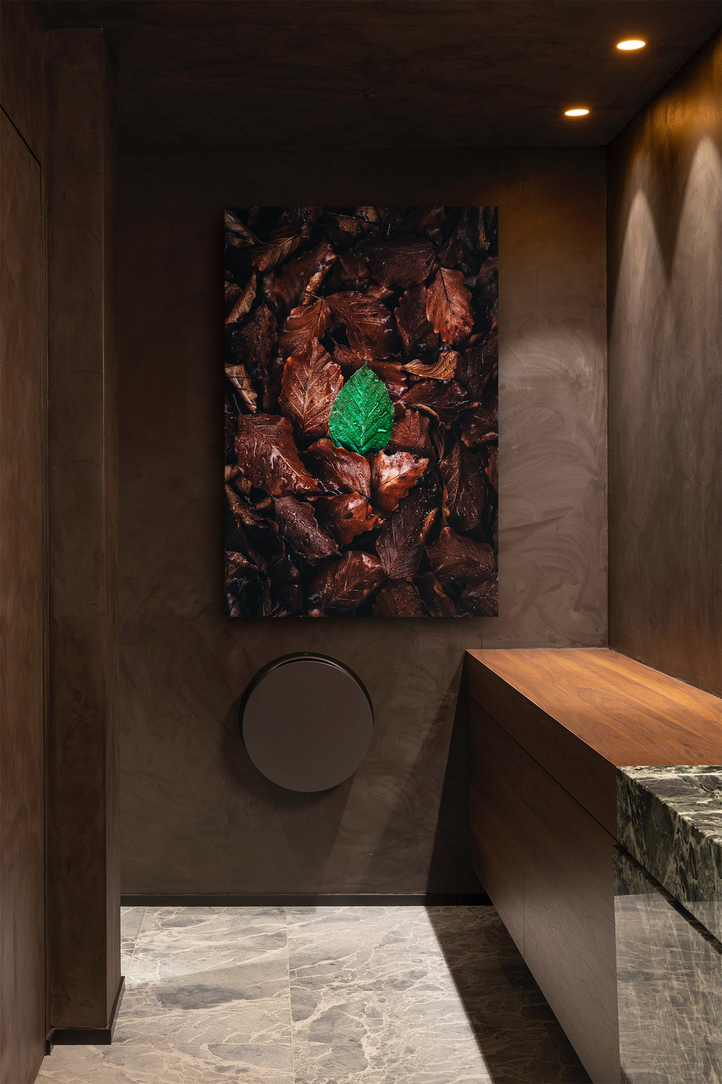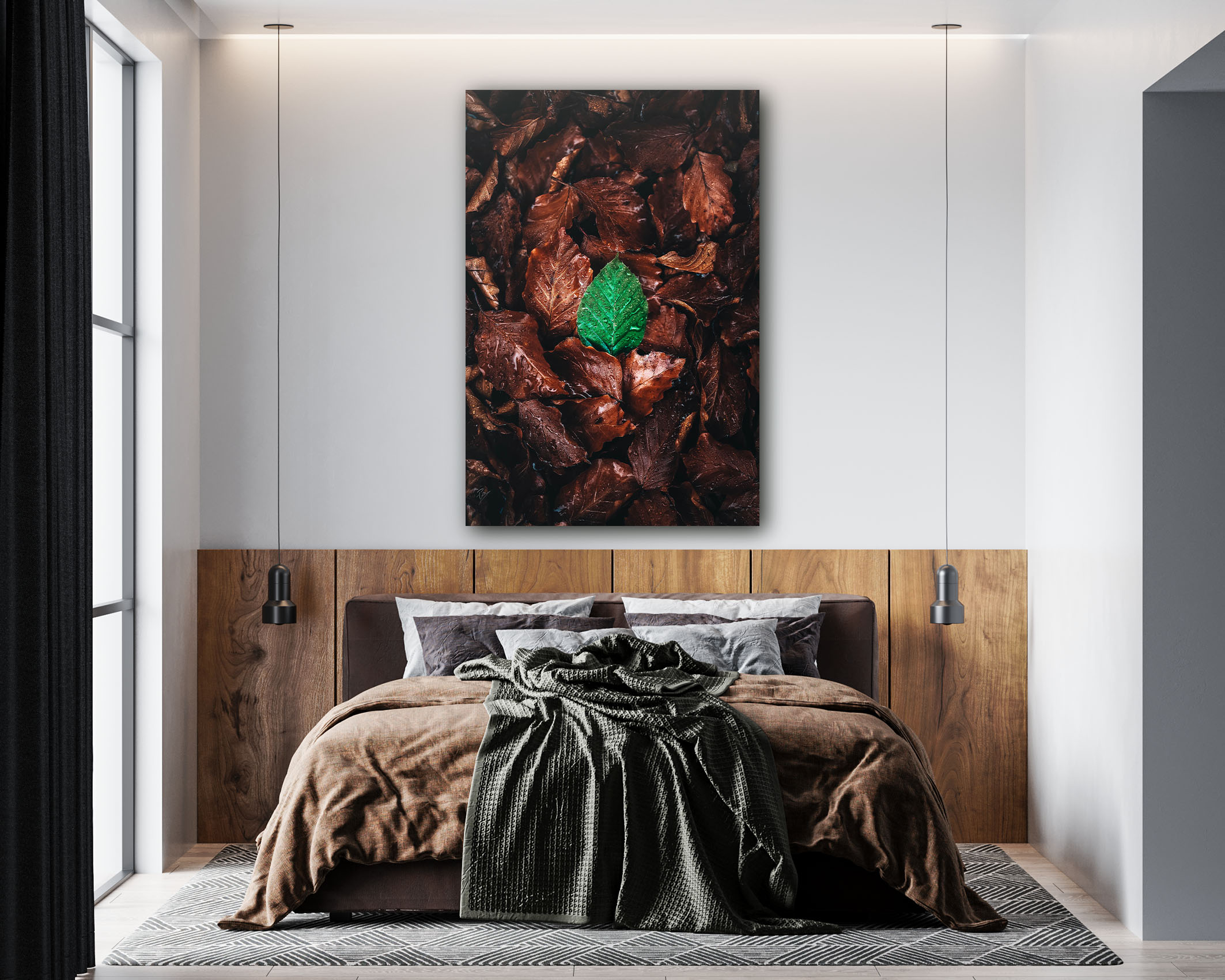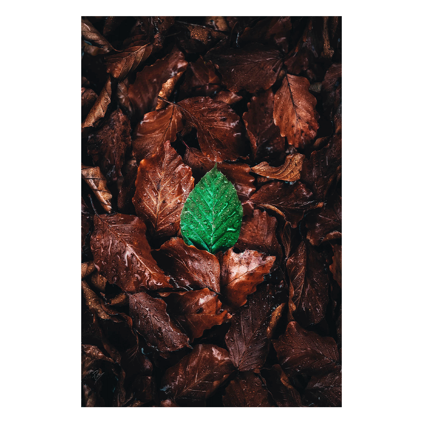 Die meisterhafte Gestaltung von Autumn’s Rebirth erzählt eine Geschichte von Veränderung und Wachstum, während der Herbst in vollem Glanz erblüht. Die sorgfältige Komposition der Blätter erzeugt ein beeindruckendes Gefühl von Tiefe und Textur, während das leuchtende grüne Blatt im Zentrum des Bildes Ihre Aufmerksamkeit einfängt und einen fesselnden Kontrast zur umgebenden Herbstpracht bietet.