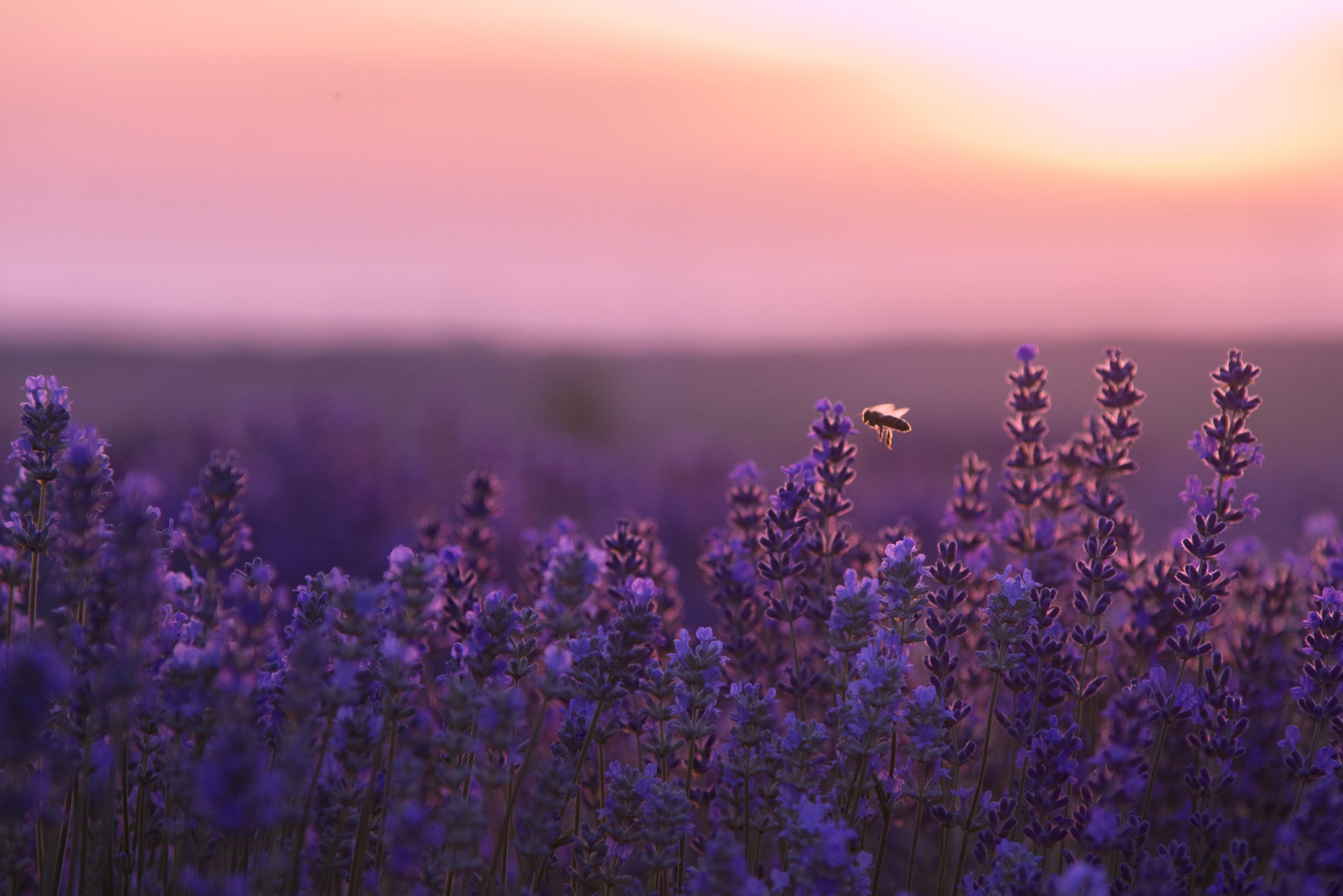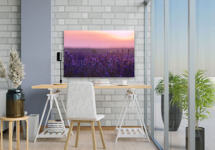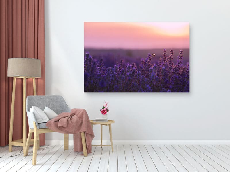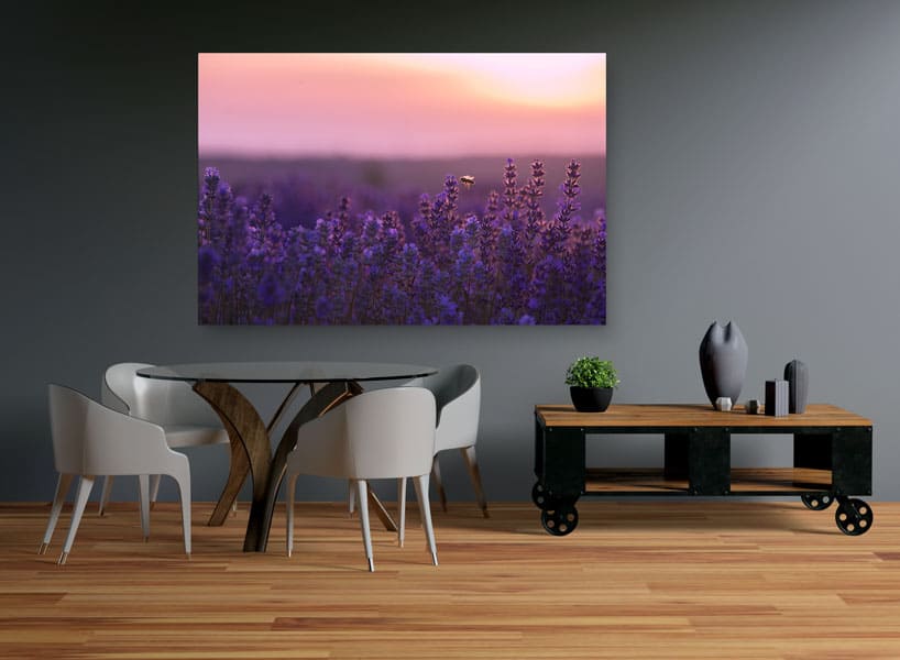 Das Wandbild Biene im Lavendelfeld zeigt die Schönheit unserer Natur. Die Lilafarbenen Blüten des Lavendels scheinen in der Abendsonne in satten Farben. Beim Betrachten des Bildes steigt einem der zarte Geruch des Lavendels in die Nase. Eine einzelne Biene fliegt an die Blüte heran, um an den Nektar der Blume zu gelangen. Besonders gut wirkt das Bild vor einem ruhigen, hellen Hintergrund.