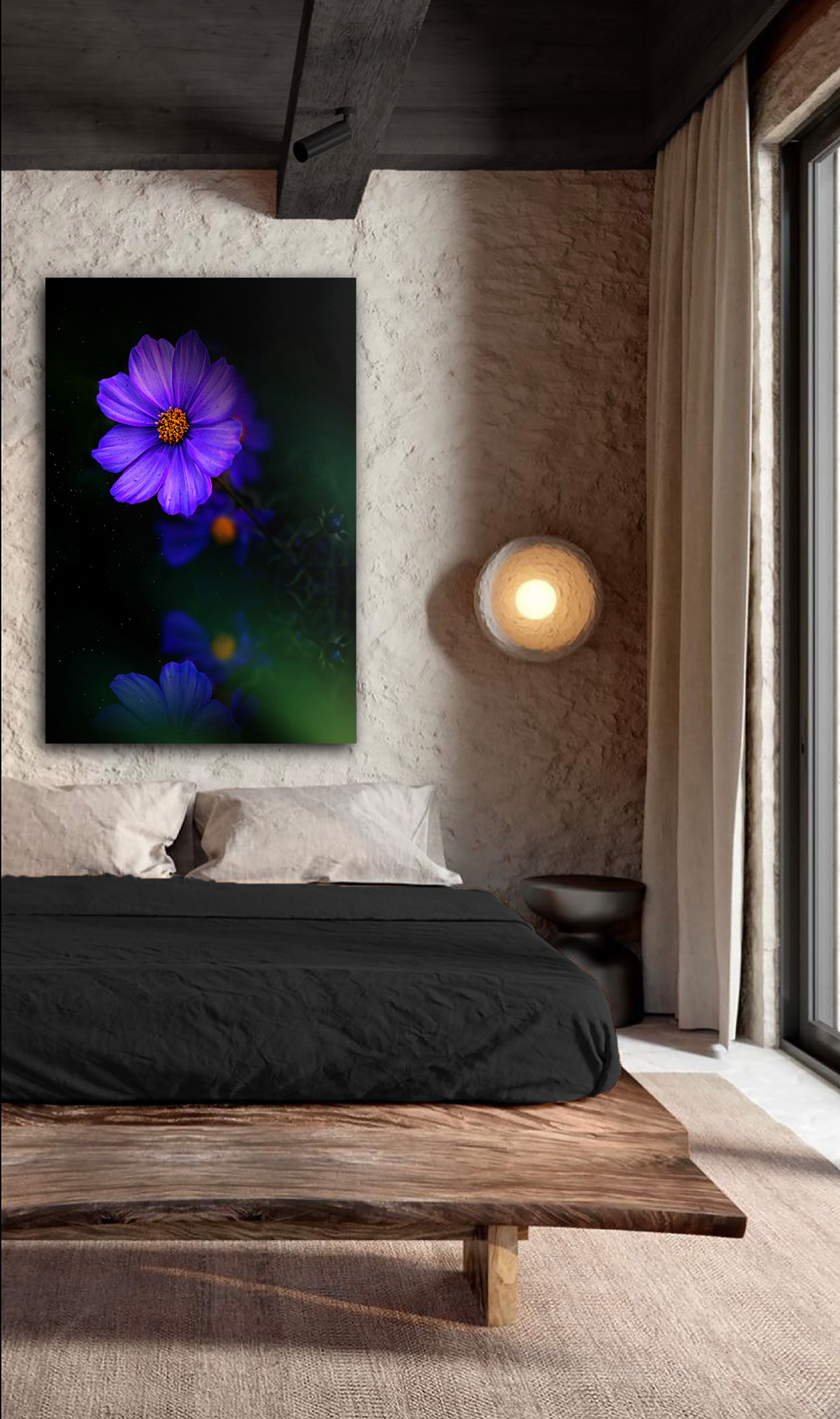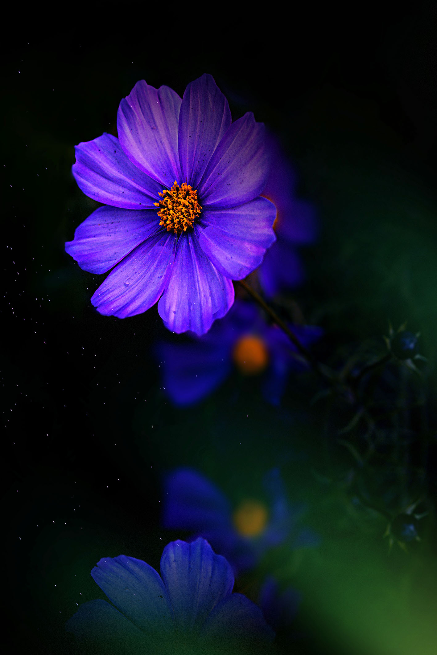 Das Wandbild Blue Reflection von Flowers and Macro ist ein wunderschönes Kunstwerk, das violette Blumen zeigt, die in der unteren Hälfte des Bildes reflektieren. Der Hintergrund ist in einem tiefen Schwarz gehalten, was einen atemberaubenden Kontrast zu den leuchtenden Blüten und kleinen weißen Partikeln bildet, die durch das Bild fliegen.