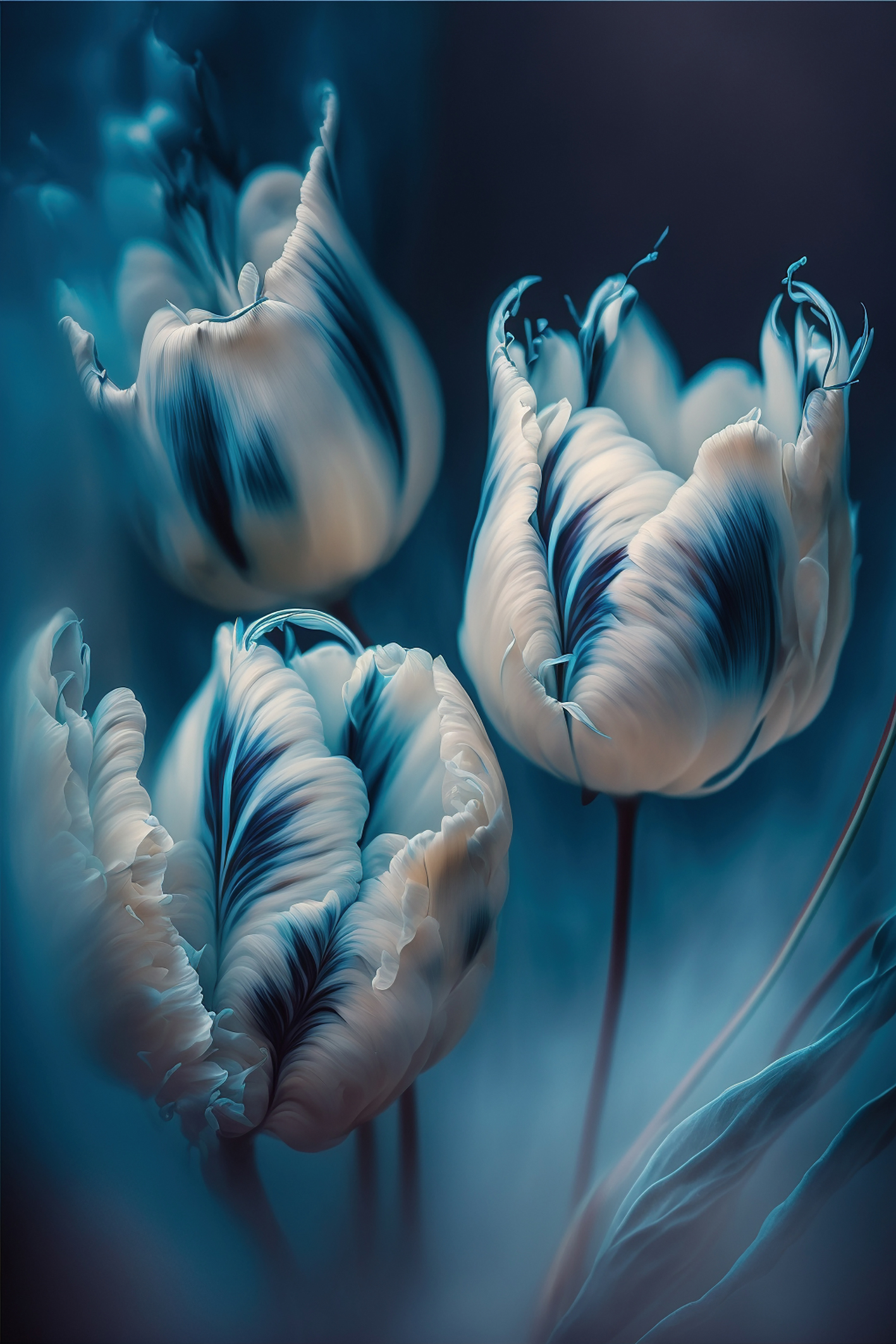 Die Illustration der Tulpen auf dem Bild ist sehr detailliert und scharf, was dem Bild eine unglaubliche Ausstrahlung verleiht. Die Kombination aus den weißen und blauen Farbtönen der Blüten harmoniert perfekt mit dem blauen Hintergrund und erzeugt eine wunderbare Stimmung.