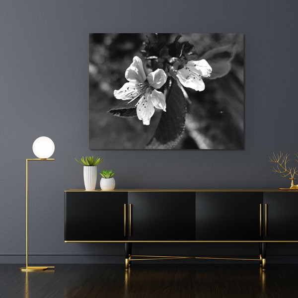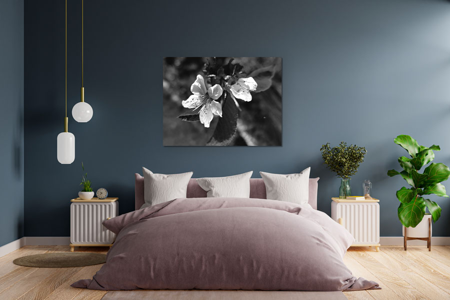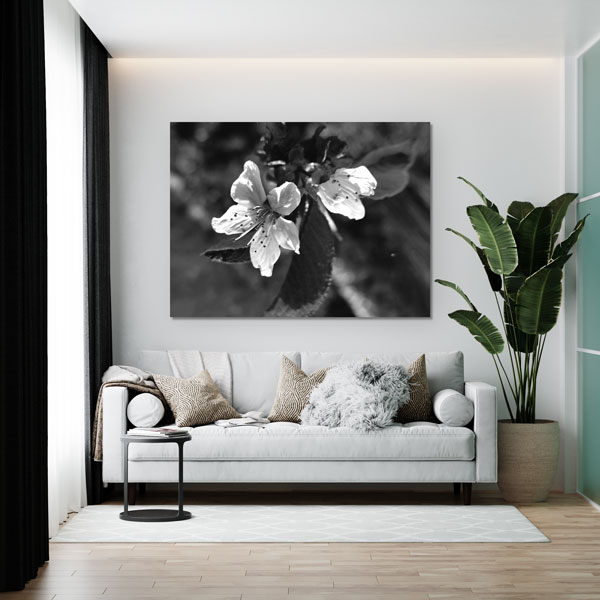 Das Bild zeigt zarte Blüten in einem Graustufenbild. Für Romantik, Wärme und Sinnlichkeit im Wohn- oder auch Schlafzimmer sind botanische Fotografien die perfekte Wahl. Diese zarte Fotokunst ist daher eine wunderbare Ergänzung für ein behagliches Zuhause.