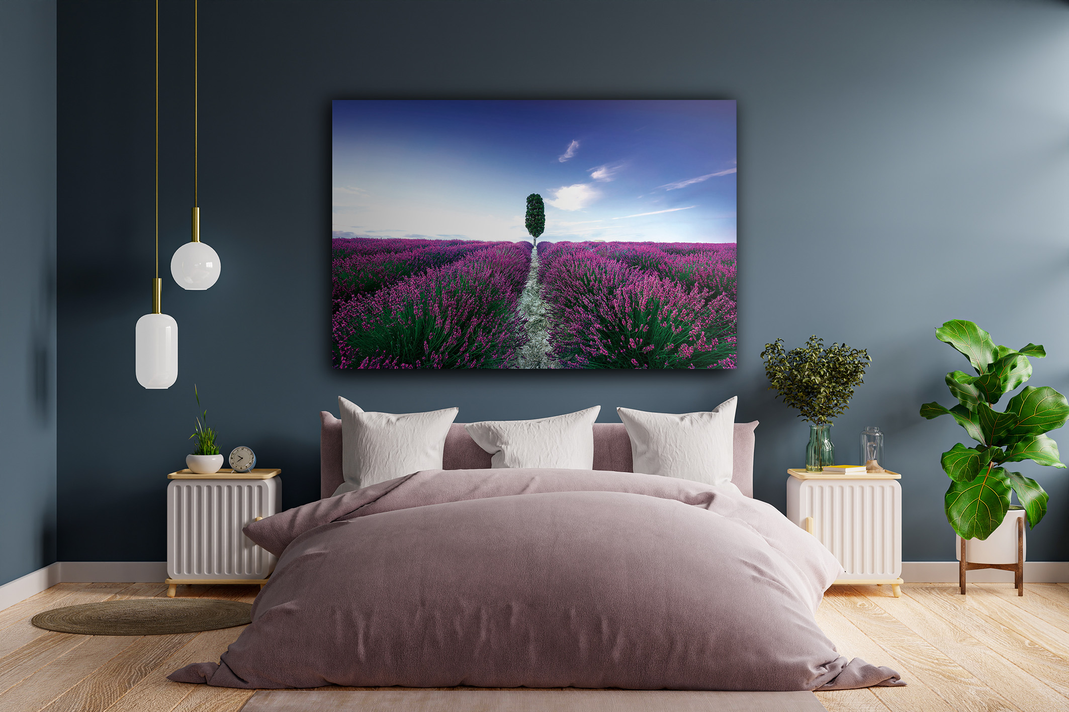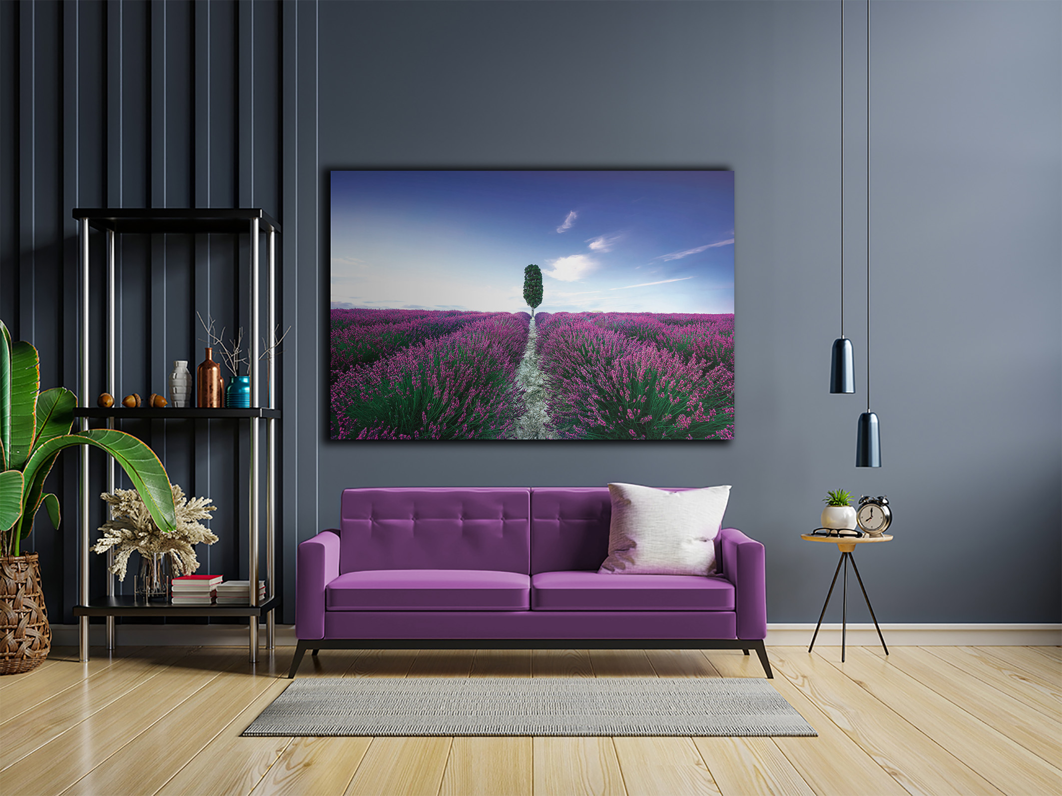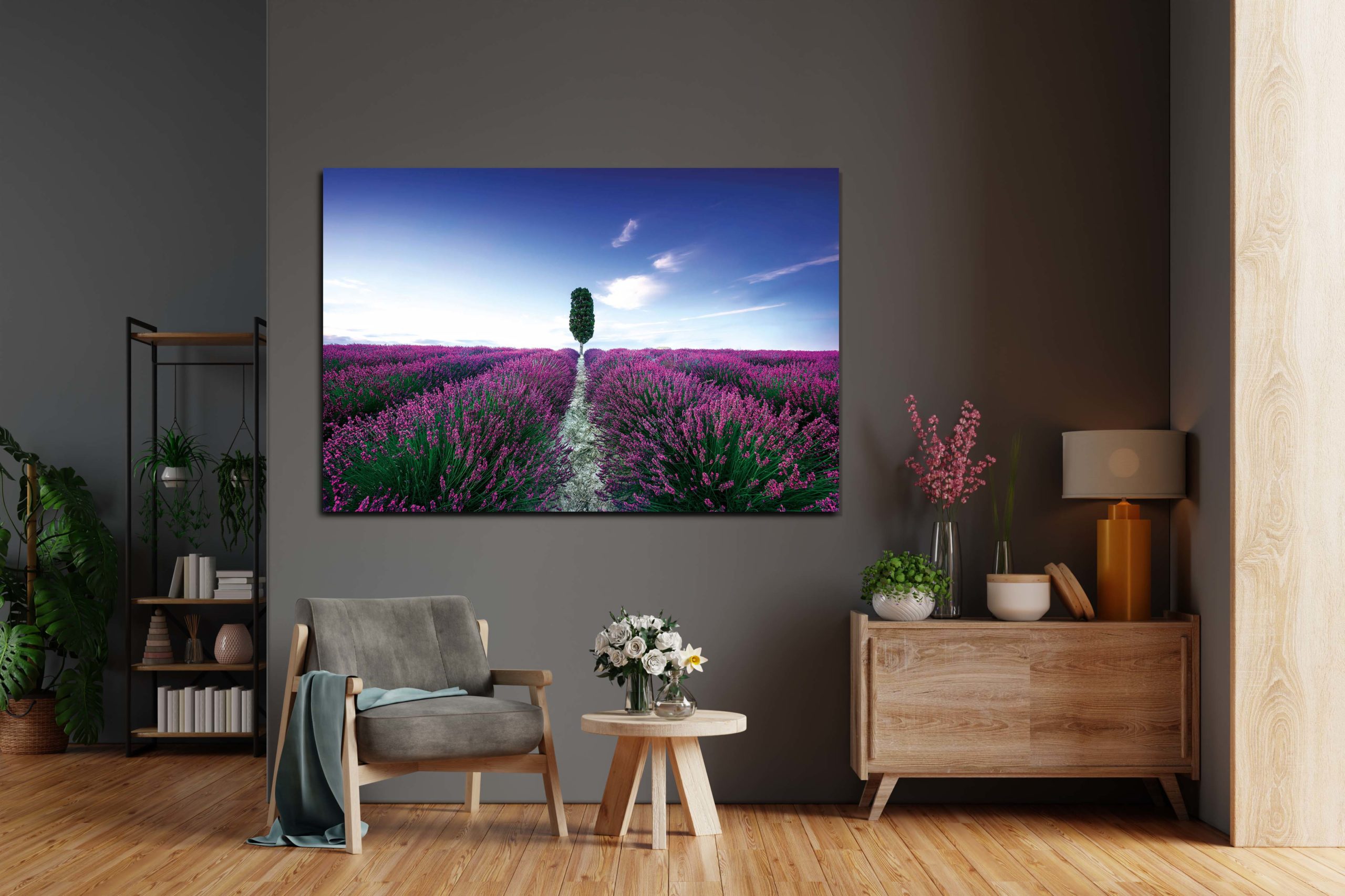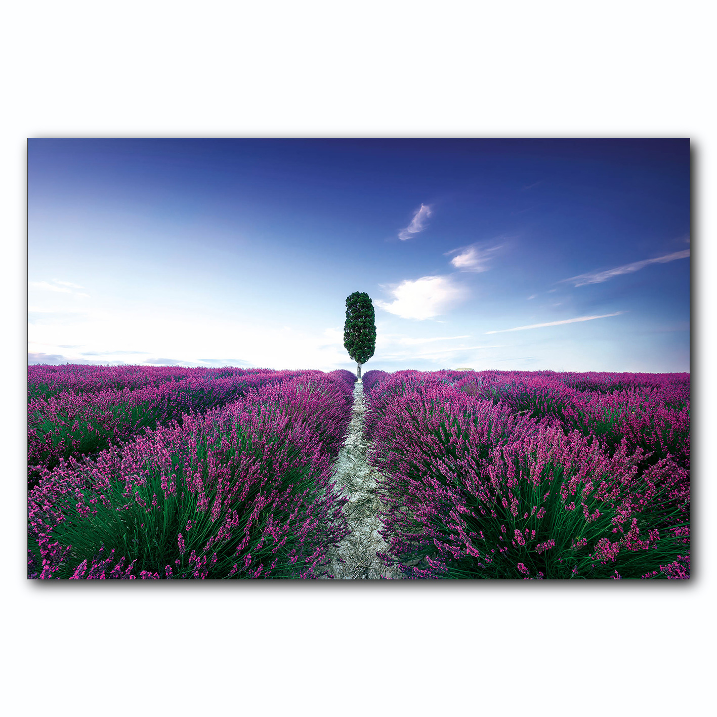 Damit dieses Motiv perfekt wirkt, empfehlen wir Ihnen für das Wandbild Blumenfeld Lavendel mit Baum das Material Acrylglas.