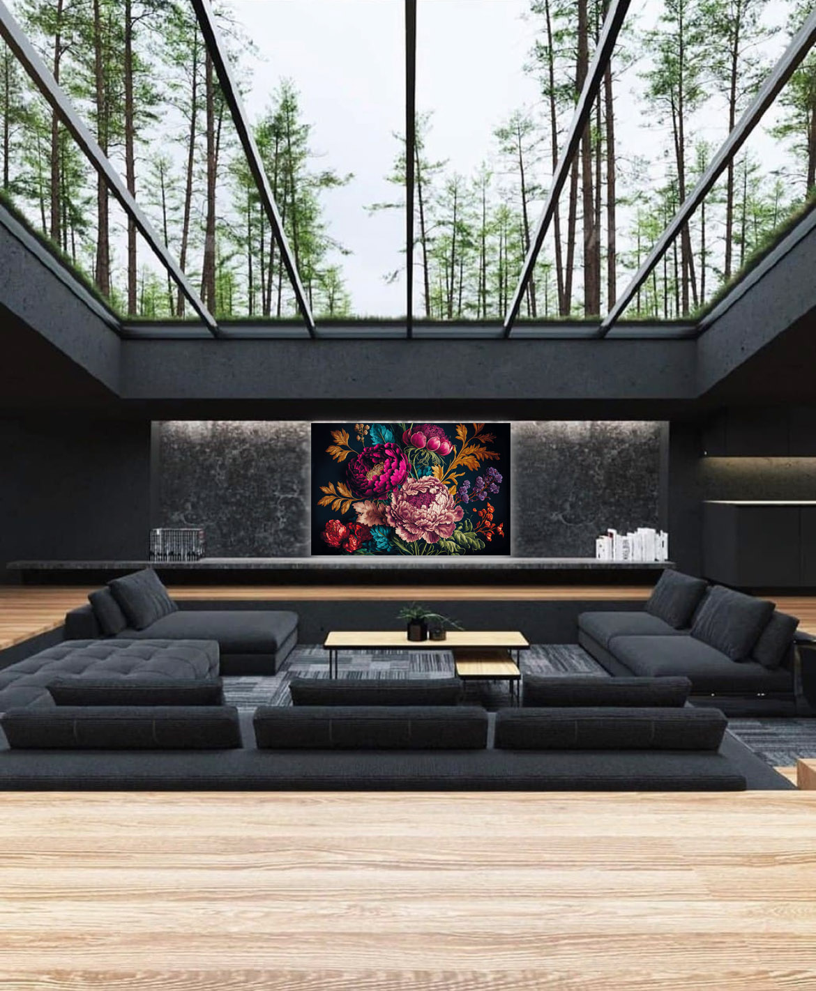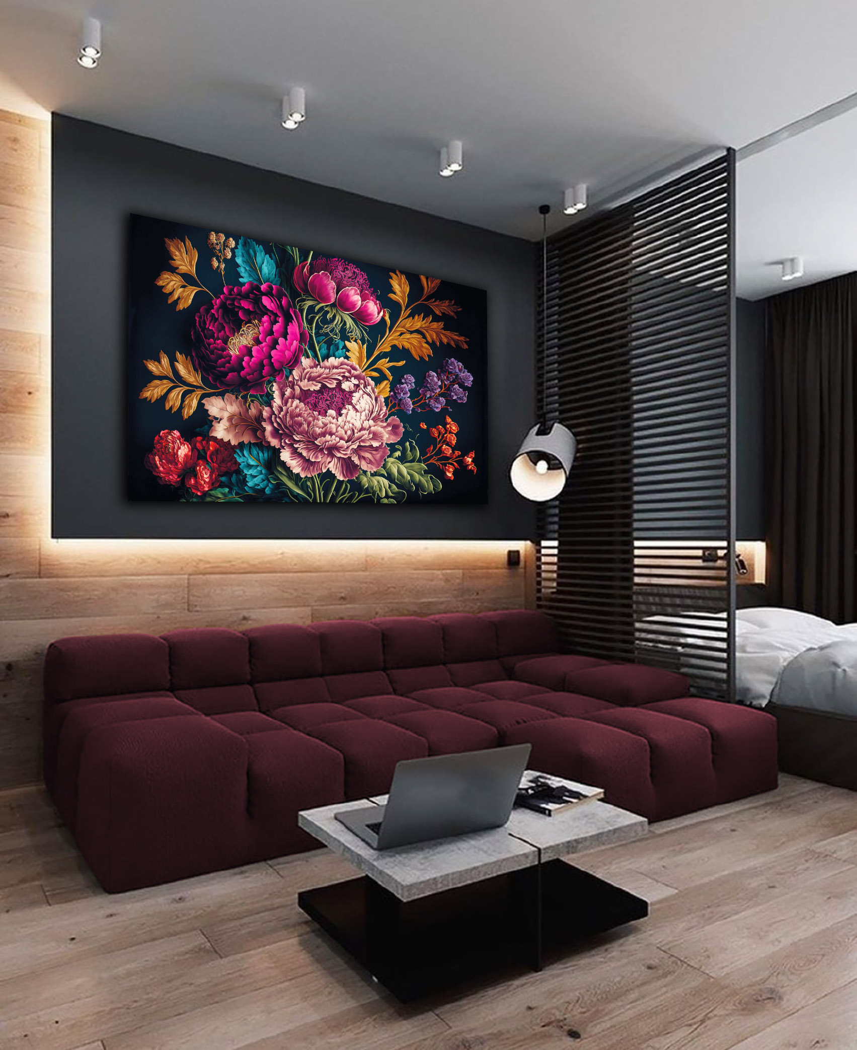 Die leuchtenden Farbtöne der Blumen erzeugen einen fesselnden Kontrast zum dunklen Hintergrund und lassen die gesamte Komposition regelrecht erstrahlen. Tauchen Sie ein in einen Blumengarten voller Intensität und Ausdruckskraft, der Ihre Räume zum Leben erweckt.