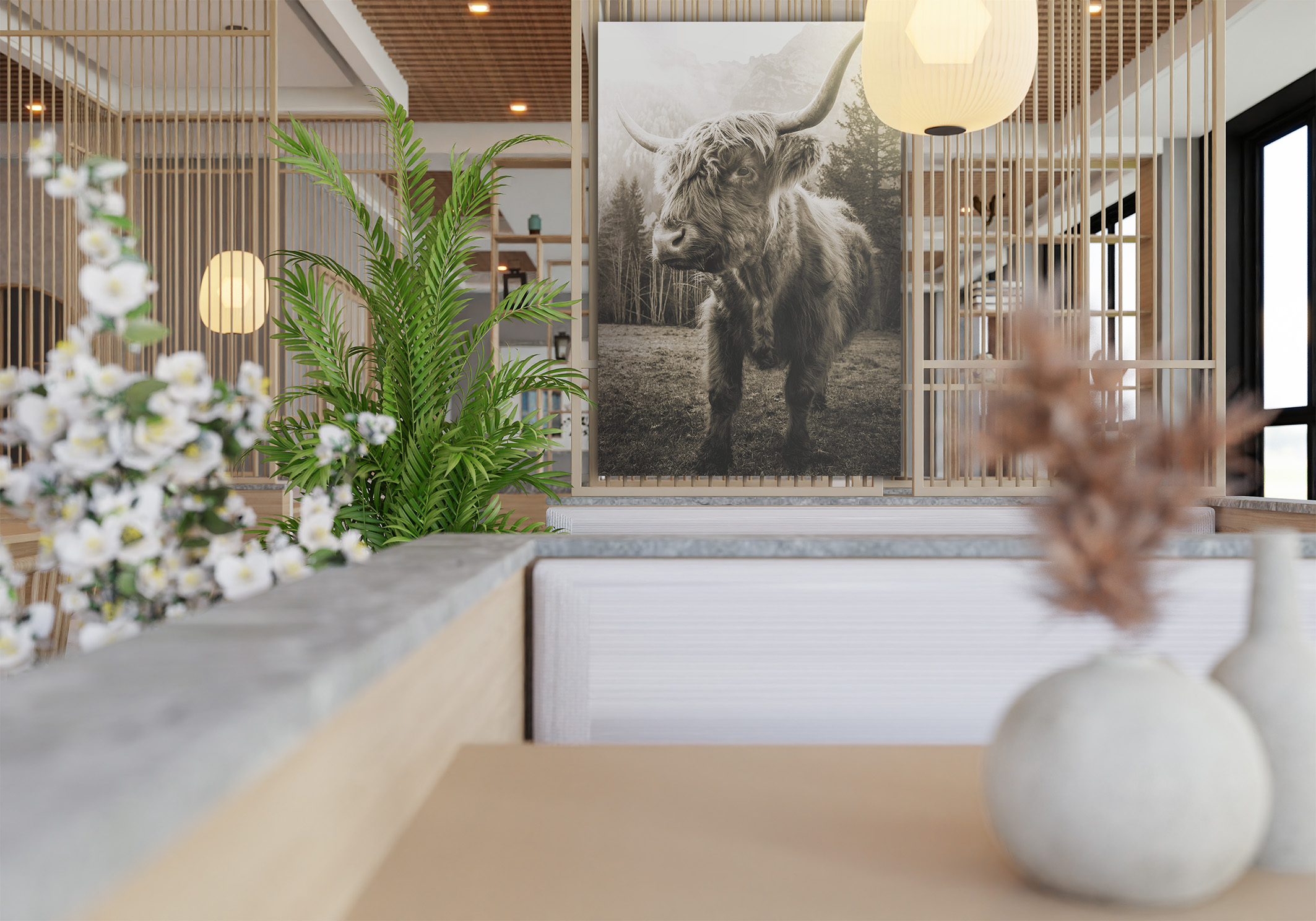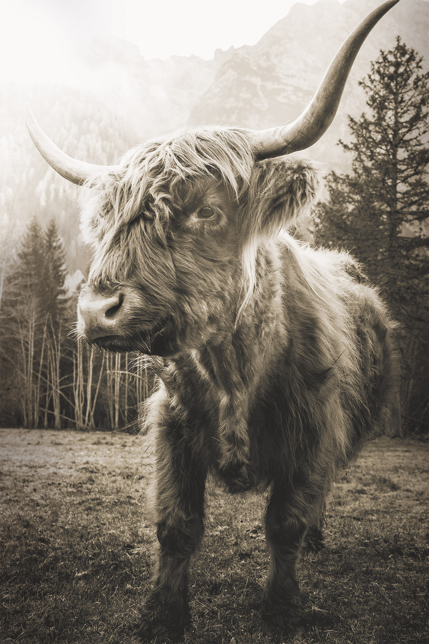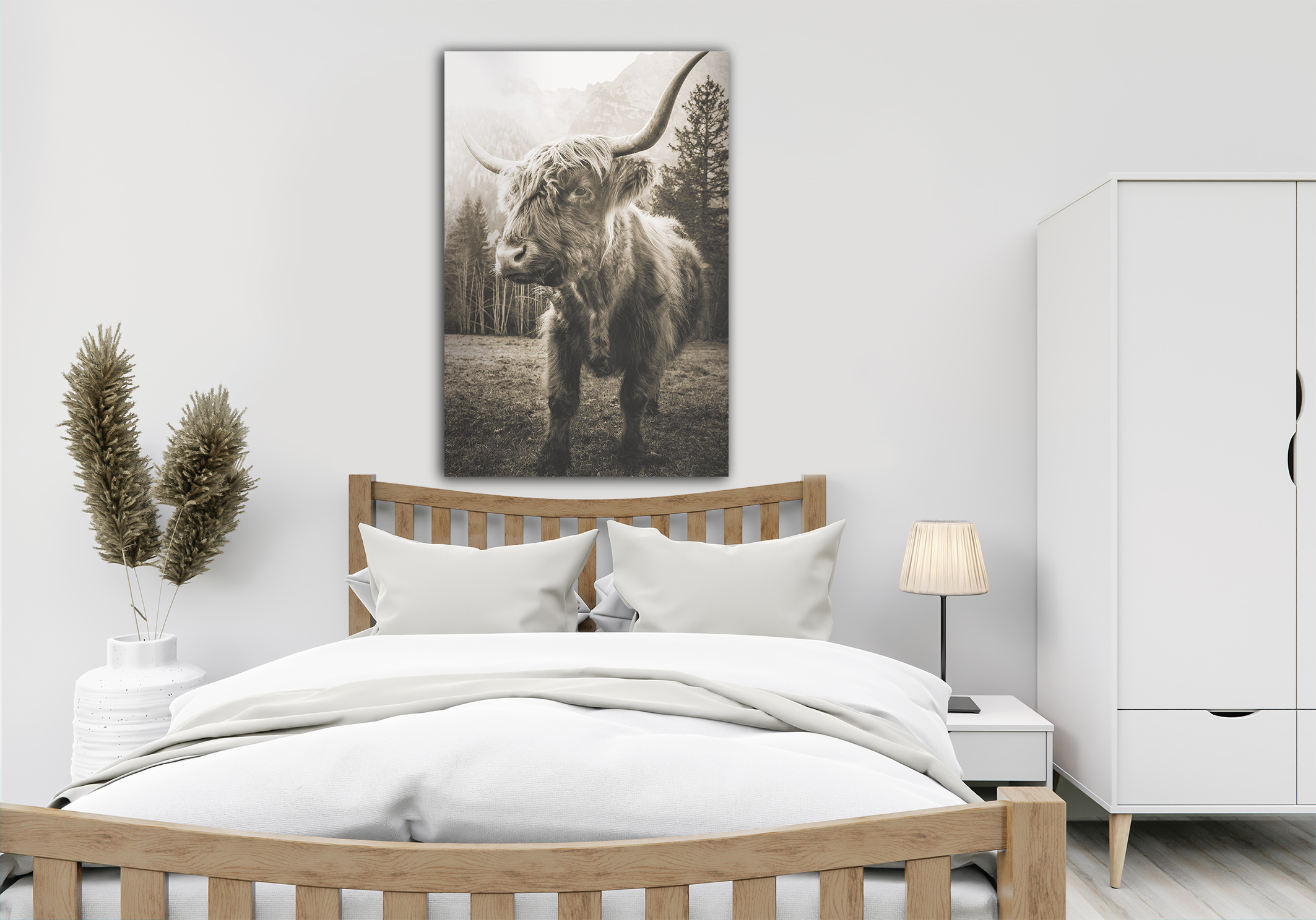 Das Wandbild Bulle stehend in Sepia zeigt eine Nahaufnahme eines Schottischen Hochlandrinds. Die Rinder gelten als gutmütig, robust und langlebig. Das markante lange Fell mit einer rot-braunen Färbung, sowie die langen spitzen Hörner machen die Hochlandrinder einzigartig und sehr beliebt. Das Rind steht auf einem Feld. Im Hintergrund sind die Berge durch den Nebel hindurch zu erkennen. Die imposante Nahaufnahme macht Ihre Wände Zuhause oder in Ihrem Büro zum echten Hingucker.