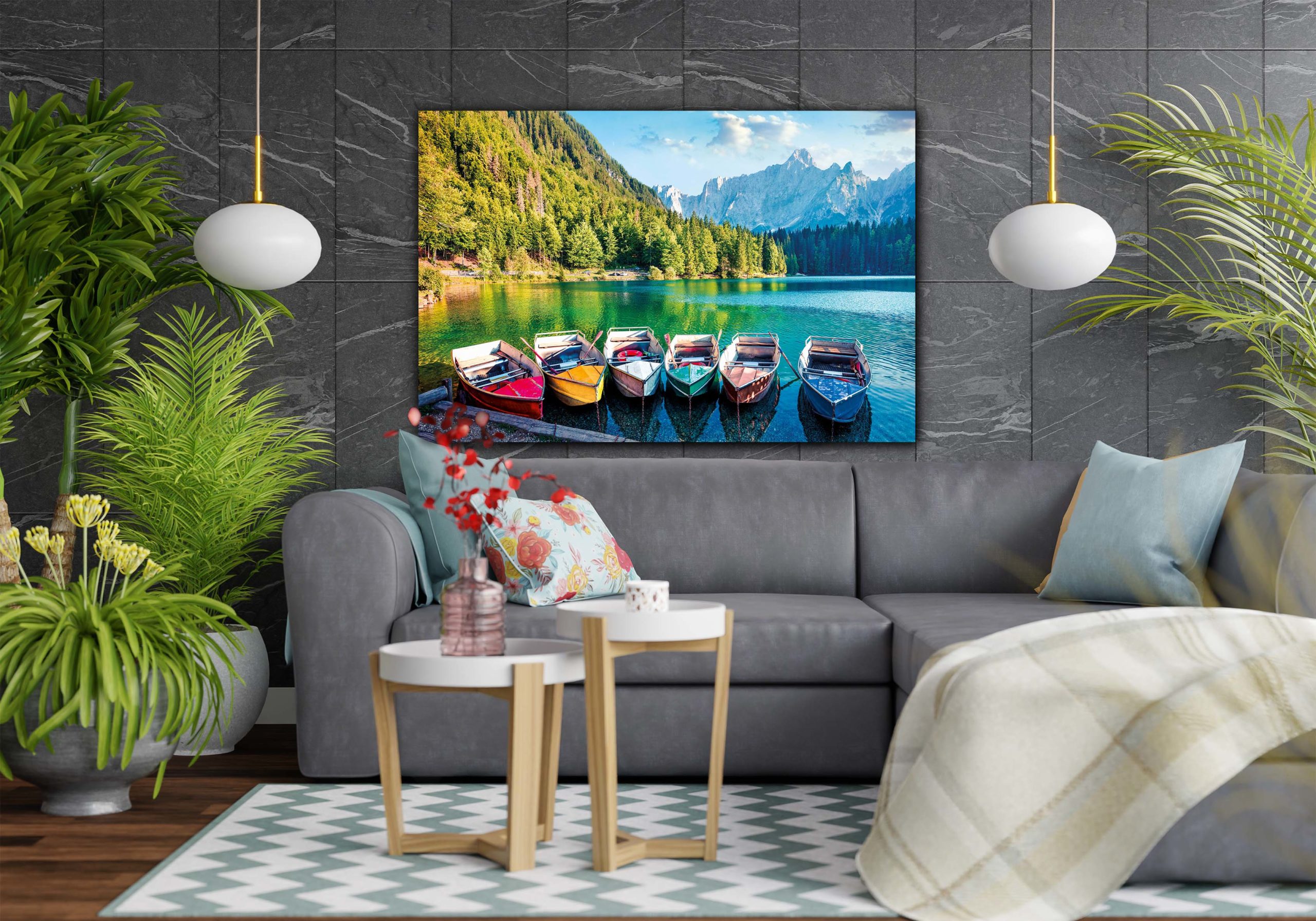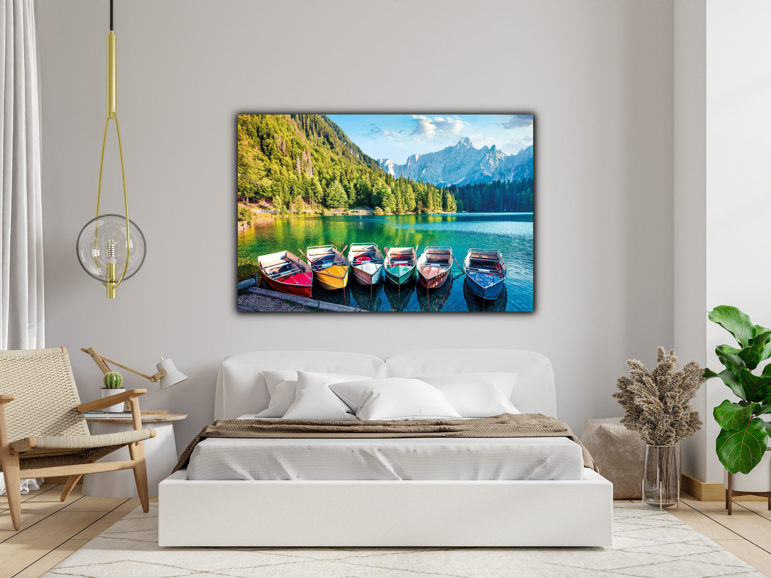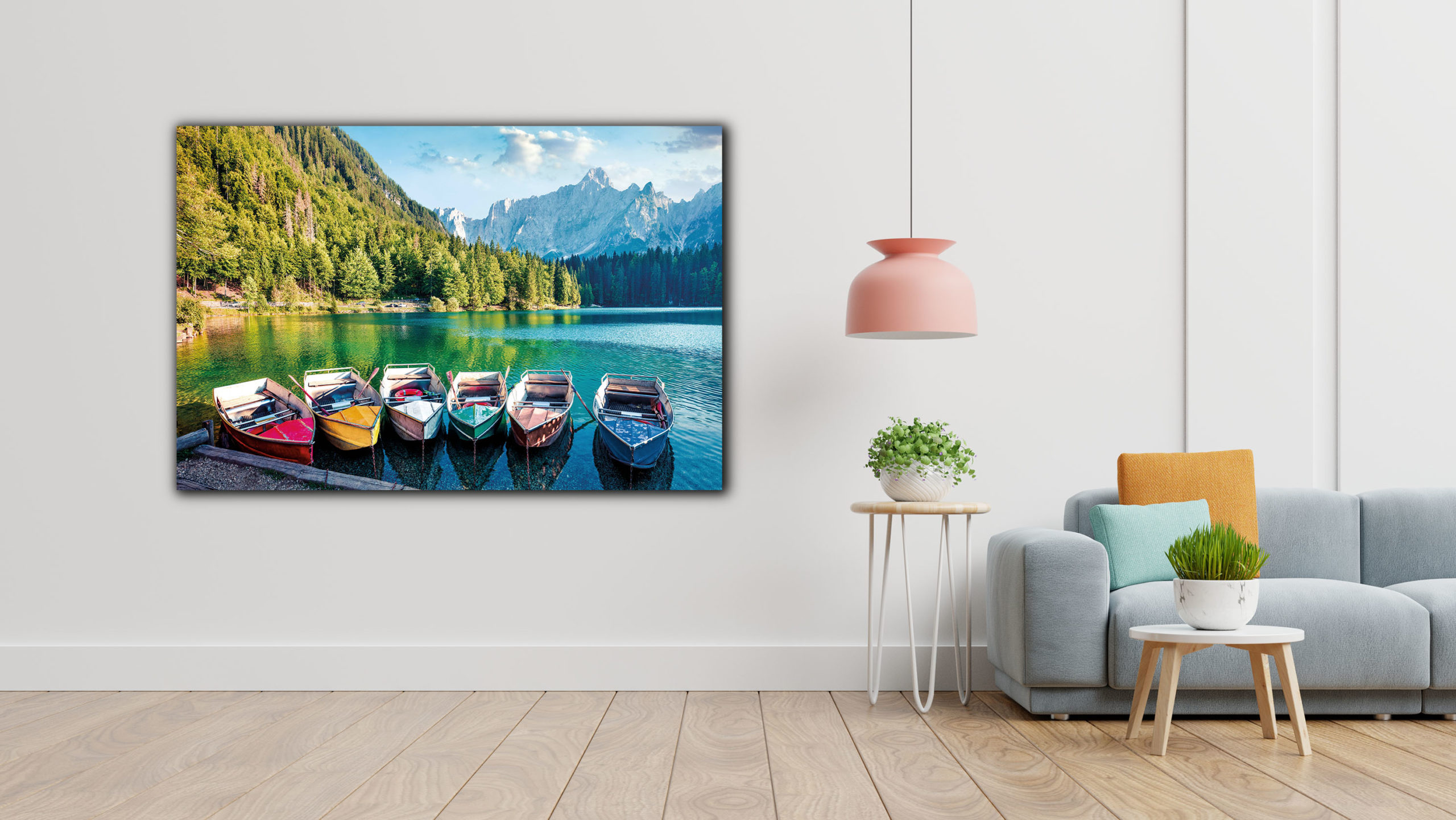 Ein Tag am See mit den Bergen am Horizont – jetzt für die Ewigkeit festgehalten. Im Vordergrund des Bildes sieht man sechs bunte Boote am Ufer eines Bergsees. Auf der Wasseroberfläche spiegeln sich die grün bewachsenen Berge, die von der Sonne angestrahlt werden. Im hinteren Teil des Wandbildes stehen die majestätischen Gipfel einer wunderschönen Berglandschaft. Mit dem Wandbild Bunte Boote holen Sie sich das Urlaubsfeeling des letztes Wanderurlaubes oder Bergurlaubes zurück.