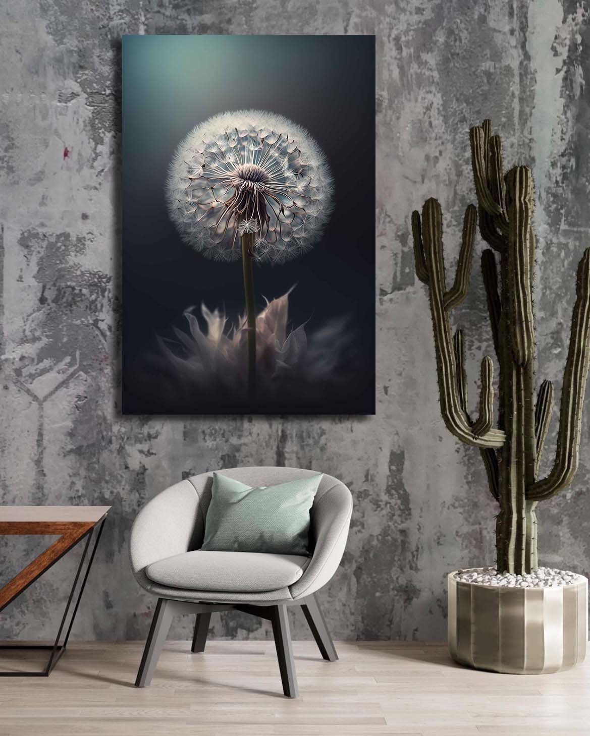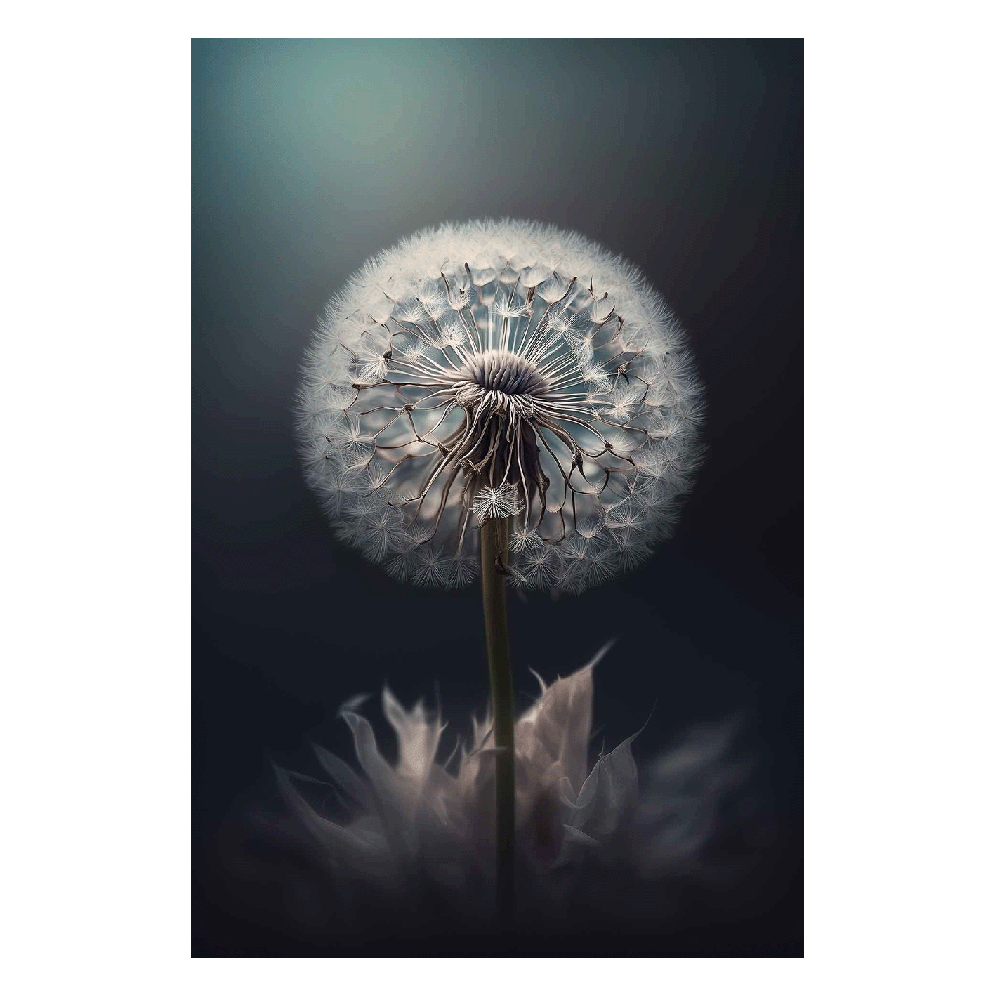 Entdecken Sie die faszinierende Schönheit des Wandbildes Dandelion von MacroBiH. Dieses Kunstwerk fängt die Anmut einer Pusteblume ein, die mit vielen kleinen, filigranen Details dargestellt ist. Der Hintergrund des Bildes ist in einem dunklen Farbton gehalten und wird von einem sanften Lichtschein erhellt, der auch auf die Blüte selbst fällt.
