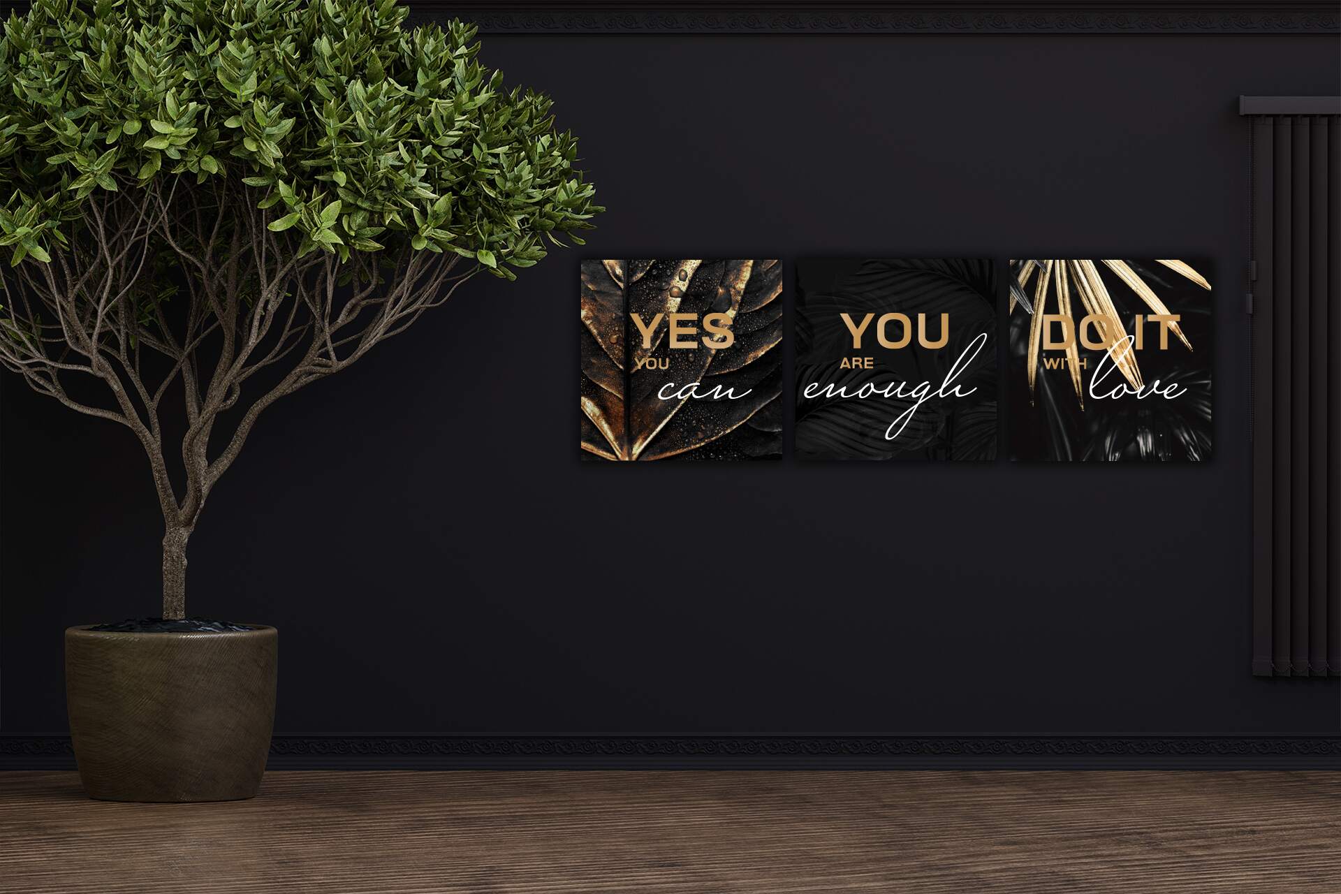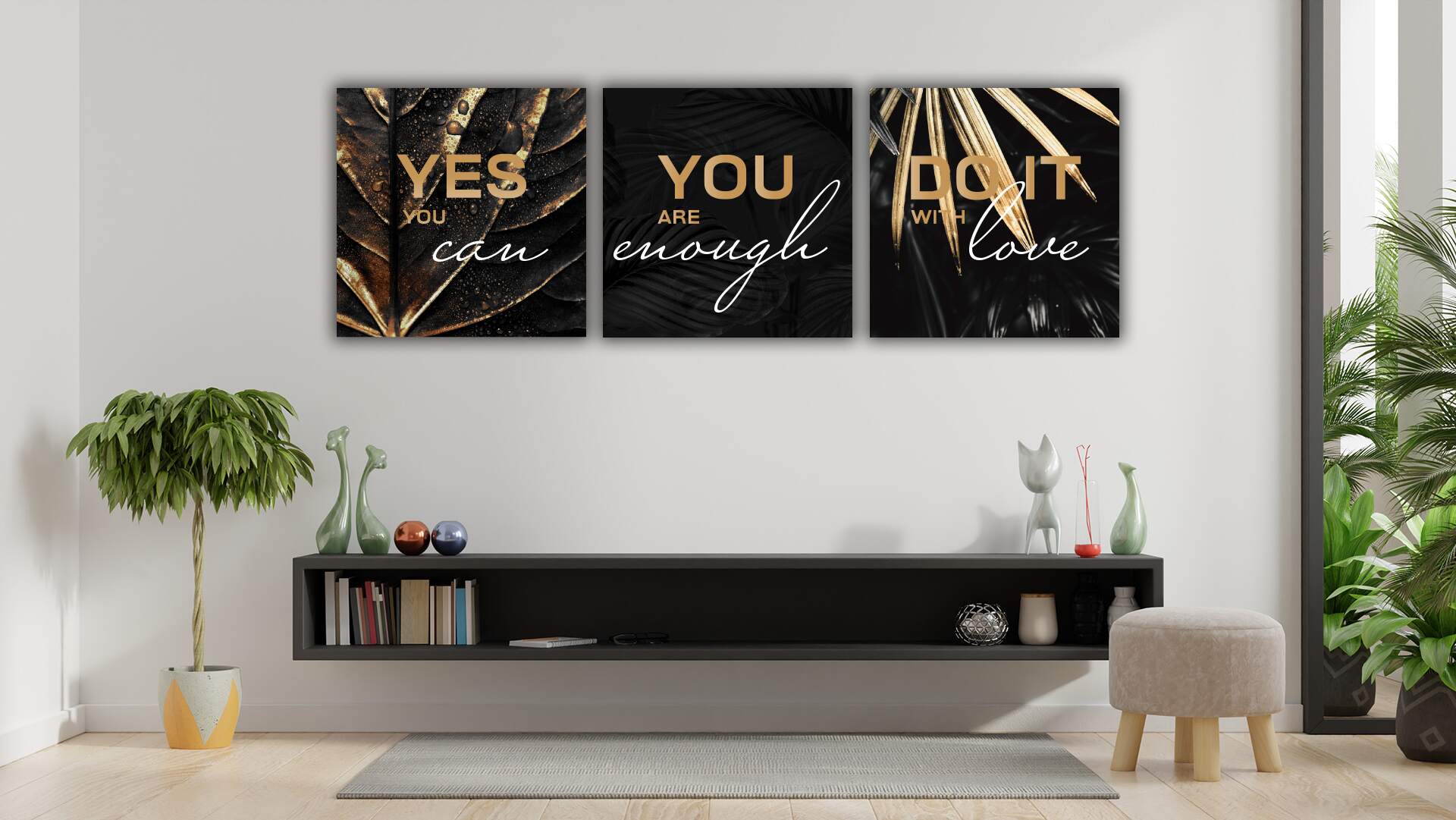 Die goldenen Töne des quadratischen Wandbildes Do it with Love geben dem Motiv einen edlen Charakter. Der Stil des Wandbildes ist modern und abstrakt. Dieses moderne Motiv wirkt einzeln als Hingucker und auch als Teil einer modernen Bilderwand. Dieses farbintensive und kontrastreiche Wandbild entfaltet seine besondere Wirkung auf einer Wand in einer zurückgenommenen, ruhigen Farbgestaltung, zum Beispiel im Wohnzimmer, Schlafzimmer, Flur oder Esszimmer. Sie brauchen genügend Raum vor dem Bild, damit Sie es mit etwas Entfernung betrachten können.
