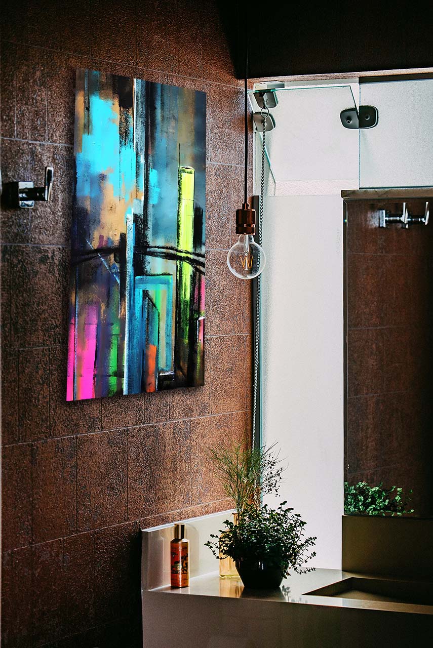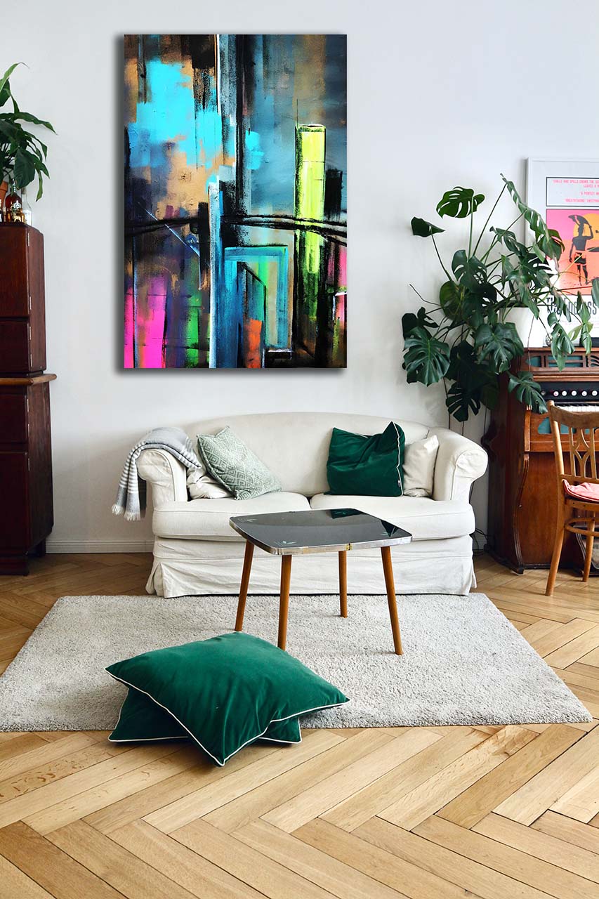 Mit Downtown holen Sie sich ein beeindruckendes Kunstwerk in Ihre Räume. Ob im Wohnzimmer, Büro oder Empfangsbereich, es wird garantiert alle Blicke auf sich ziehen und ein Gesprächsthema sein. Die abstrakte Interpretation der Großstadt fügt jedem Raum eine moderne und künstlerische Note hinzu.