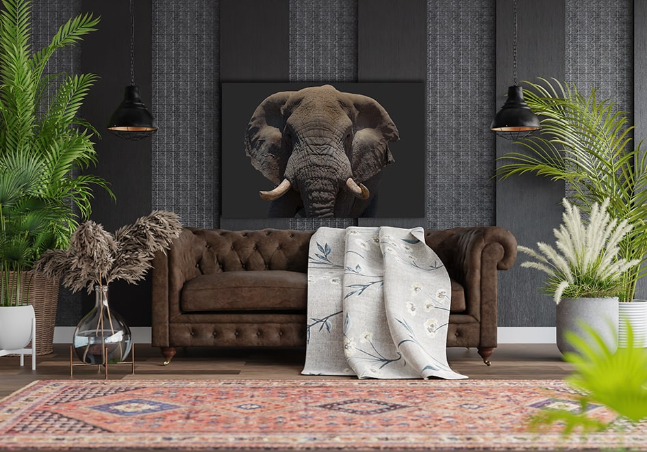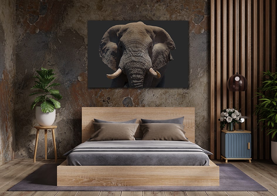 Waren Sie einem Elefant schon einmal so nah, dass Sie die Struktur seiner Haut und jede Hautfalte sehen konnten? Mit dem Wandbild Elefantenkopf im Querformat haben Sie nun die Chance dazu – bequem von Ihrem Wohnzimmer aus. Auf dem Bild sehen Sie die imposante Nahaufnahme eines Elefantenkopfes auf dunklem Hintergrund. Die verschiedene Schwarz-, Braun- und Grautöne lassen den Elefanten sehr geheimnisvoll wirken. Holen Sie sich ein Stück der Wildnis Afrikas in Ihr Zuhause.