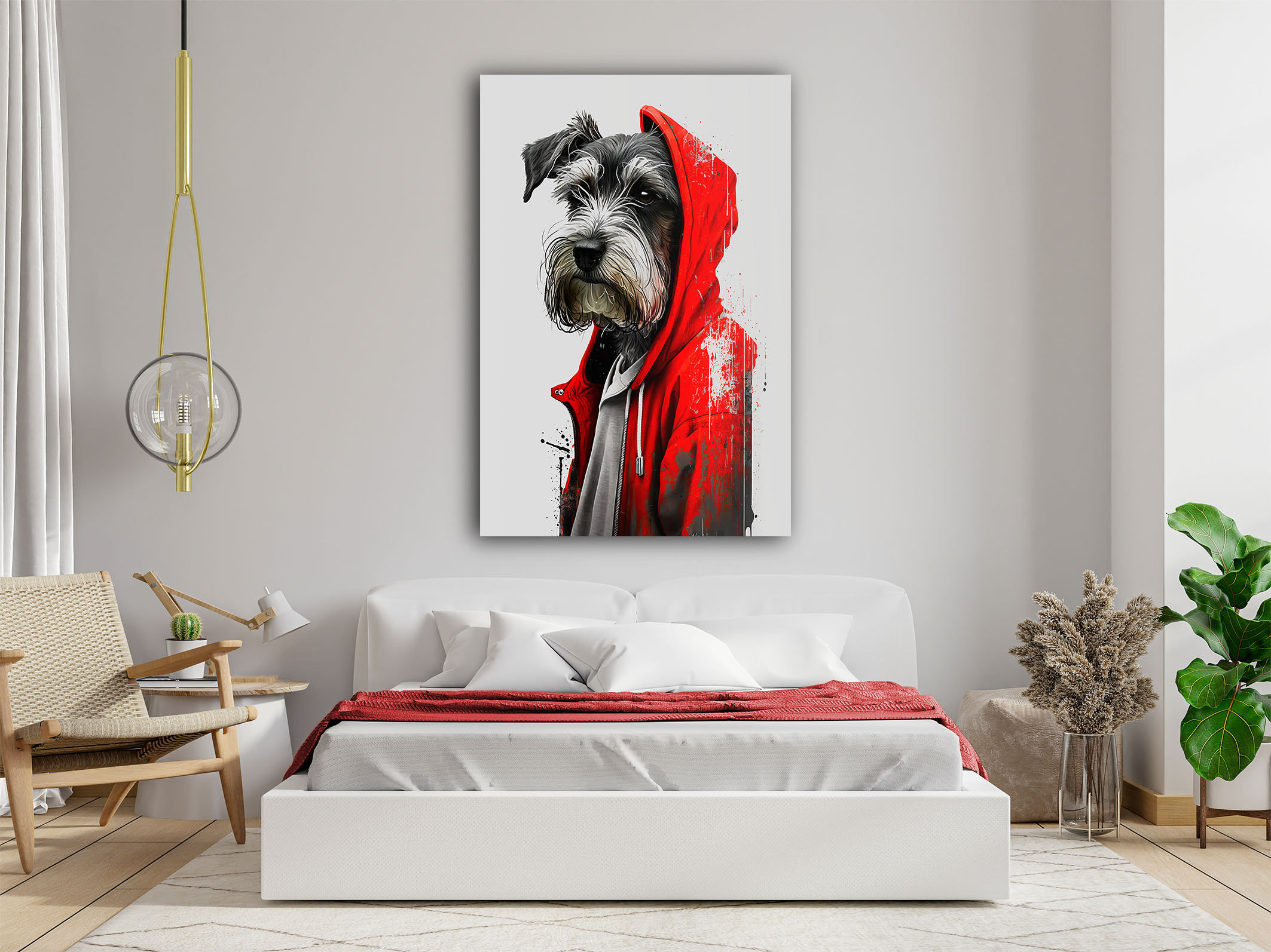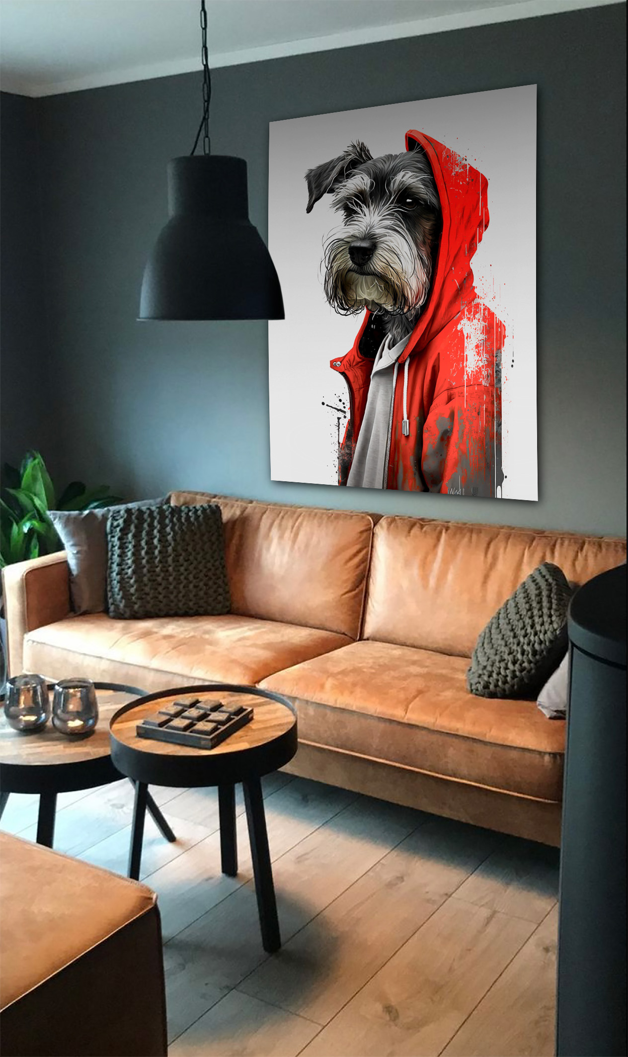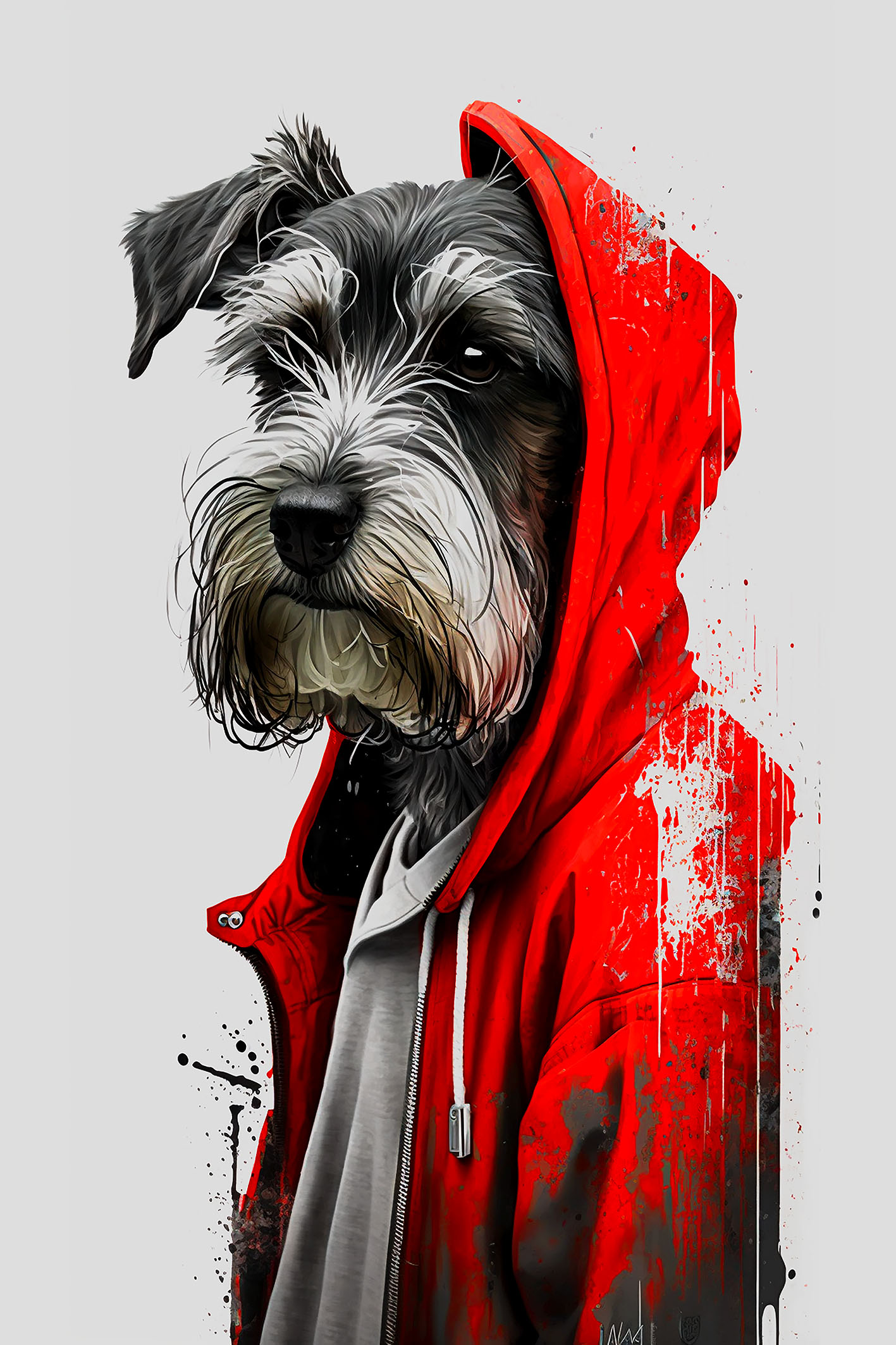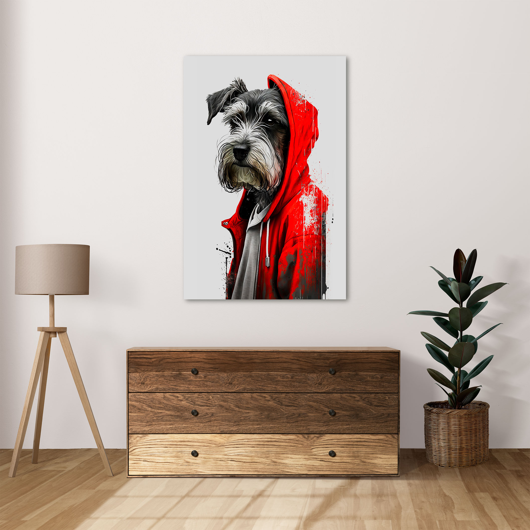 Wir präsentieren Ihnen unser Wandbild Fashion Dog No.2, eine wunderschöne Illustration eines schnuckeligen Schnauzers in einer sportlichen roten Kapuzenjacke. Dieses Kunstwerk ist eine perfekte Wahl für jeden Hundeliebhaber und Mode-Enthusiasten.