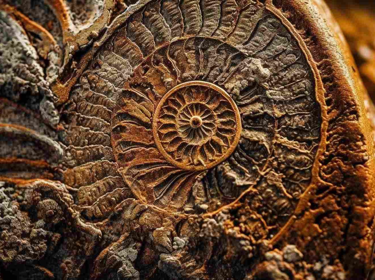 In der Mitte des Wandbildes Fossil befindet sich das Hauptmerkmal: Ein atemberaubendes Fossil eines prähistorischen Lebewesens, das in detailreicher Präzision dargestellt ist. Die goldenen und braunen Farbtöne verleihen dem Fossil eine warme, nostalgische Aura, als ob es von den sanften Strahlen der untergehenden Sonne beleuchtet wird. Die Textur des Fossils wird meisterhaft wiedergegeben – die feinen Linien, Rillen und Strukturen erzählen von seiner langen Reise durch die Zeitalter.