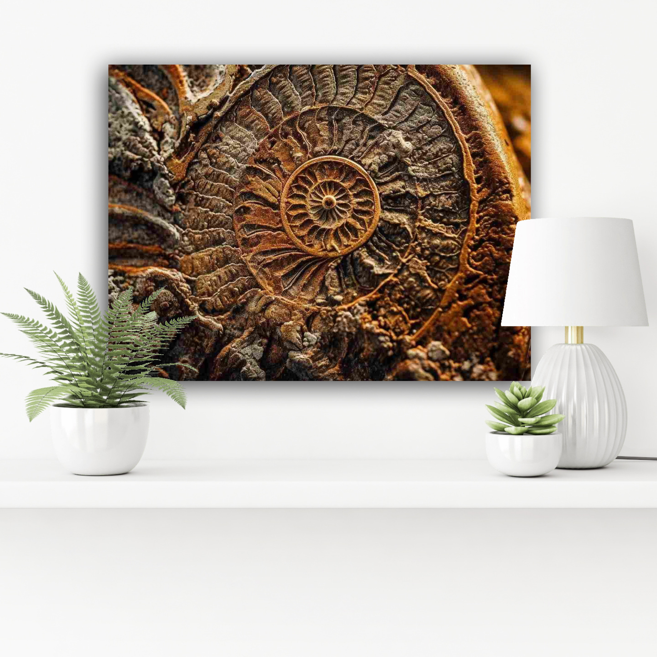 Das Wandbild präsentiert ein beeindruckendes Motiv eines Fossils, das in seltenen, faszinierenden Goldbrauntönen gehalten ist. Die Szene entfaltet sich vor dem Betrachter wie ein Fenster in die Vergangenheit, in eine längst vergessene Ära. Die Kombination aus realistischer Darstellung und künstlerischer Interpretation verleiht dem Bild eine zeitlose Ästhetik.