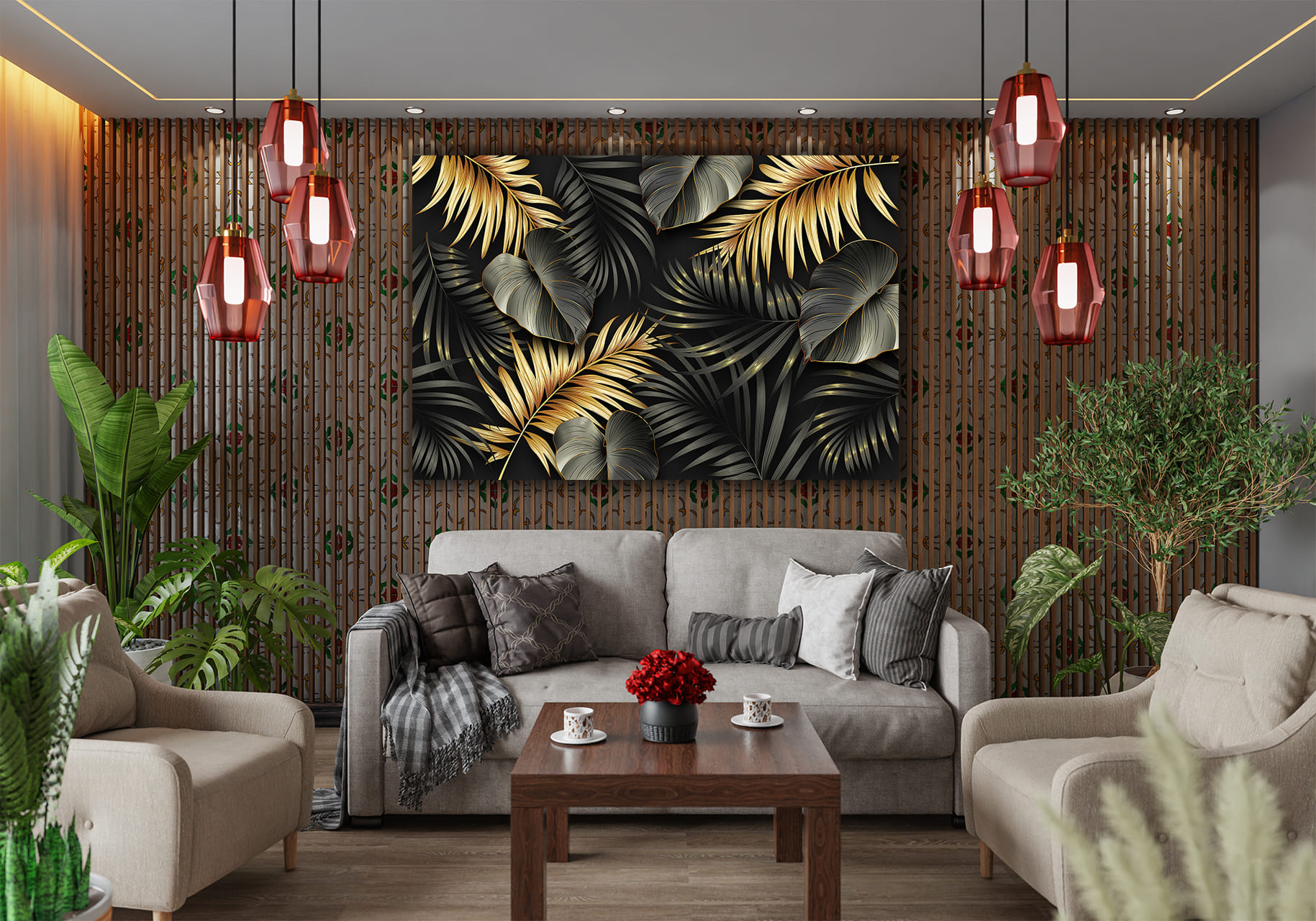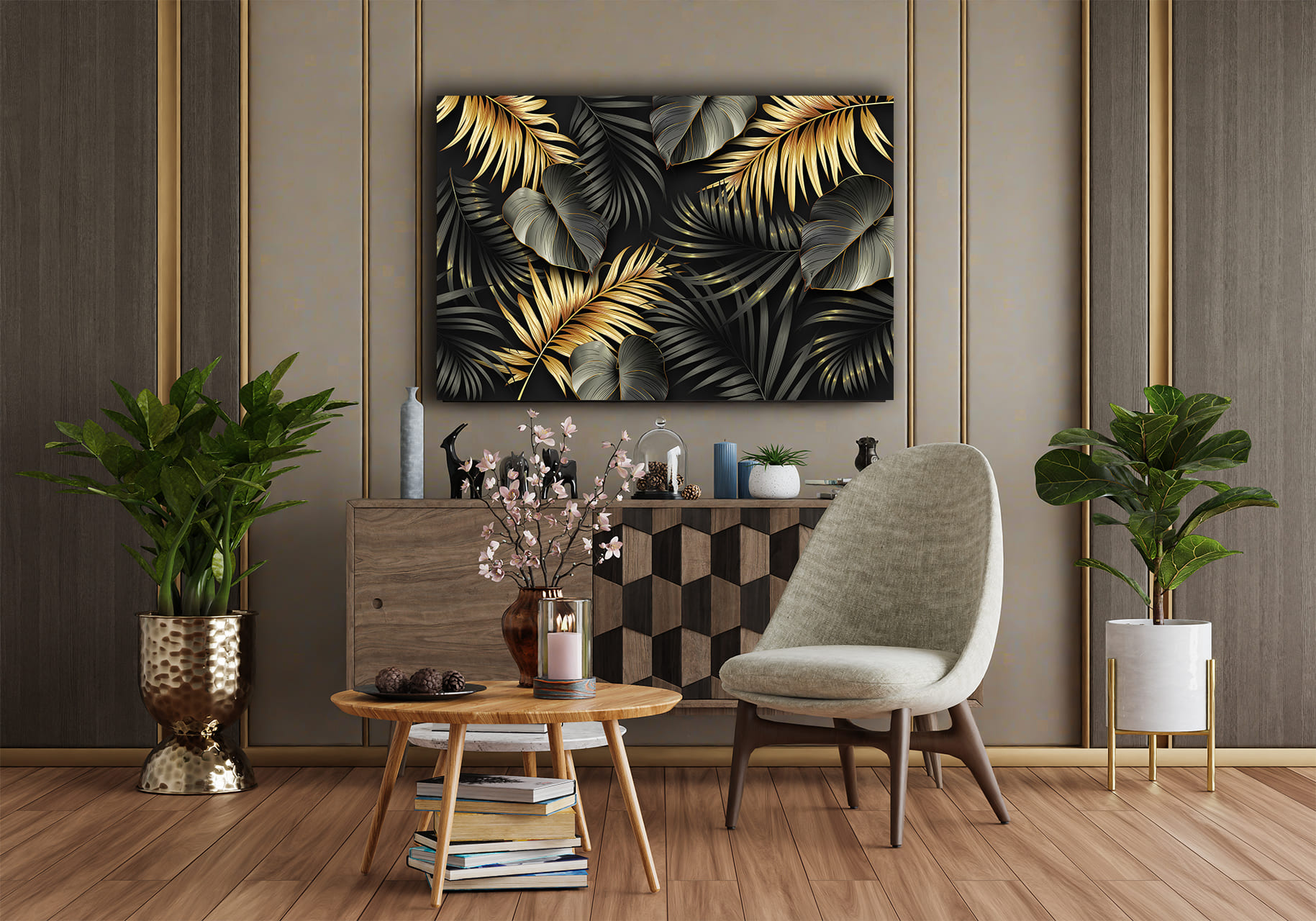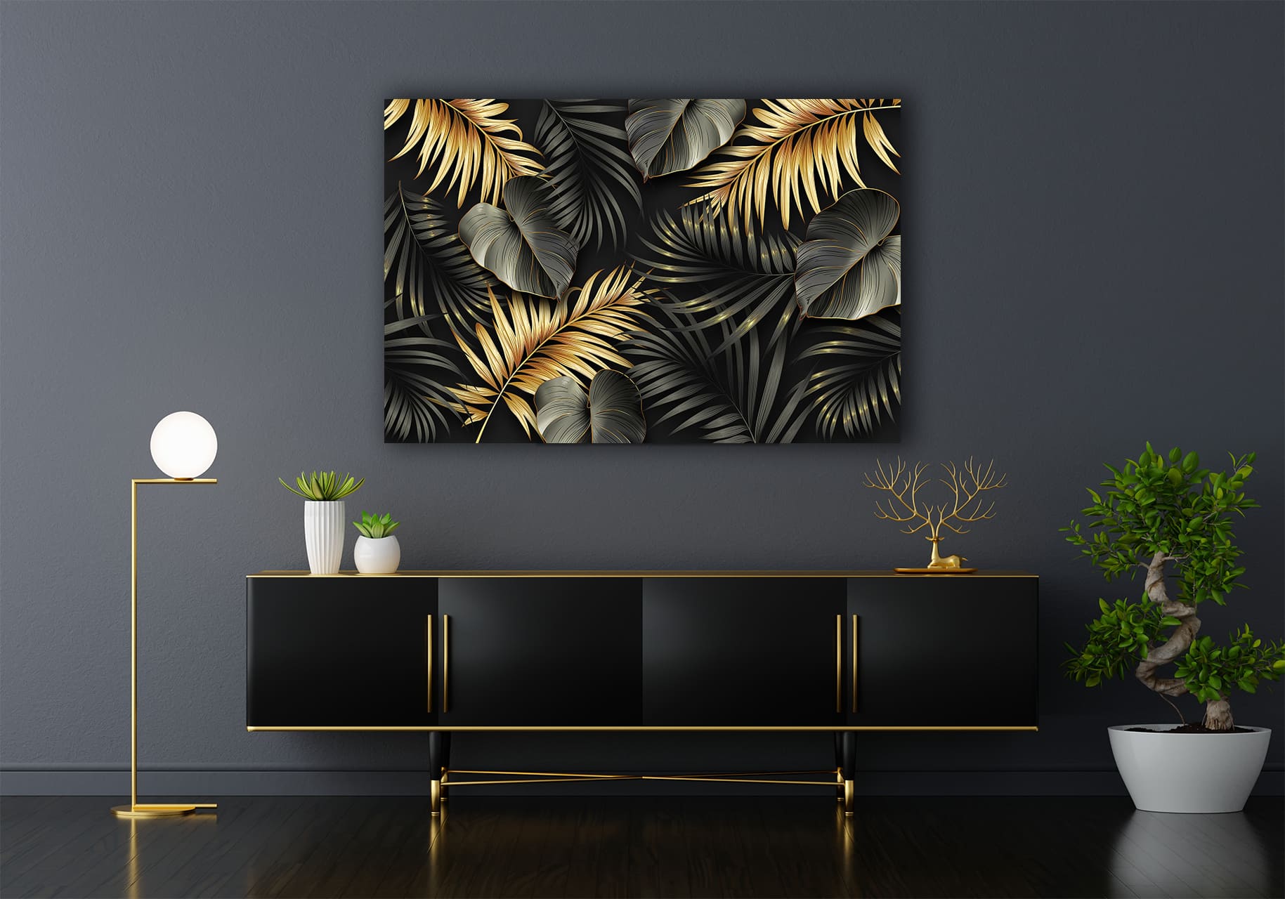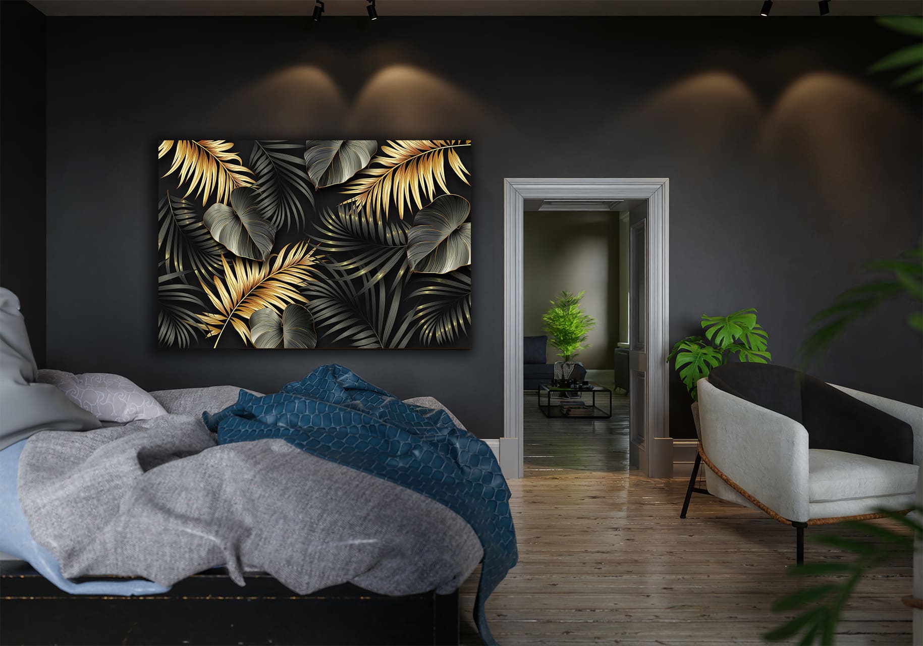 Das Wandbild Goldene Blätter kann seine volle Wirkung sowohl auf dunklen, als auch auf hellen Untergründen gut entfalten. Die goldfarbenen Blätter stehen in einem tollen Kontrast zu den grauen Blättern und dem schwarzen Hintergrund des Wandbildes. Die zarten Stränge wirken leicht und elegant. Unser Tipp: Für das besondere Highlight an Ihren Wänden, empfehlen wir für das Wandbild Goldene Blätter den Druck auf Acrylglas oder AluDibond.