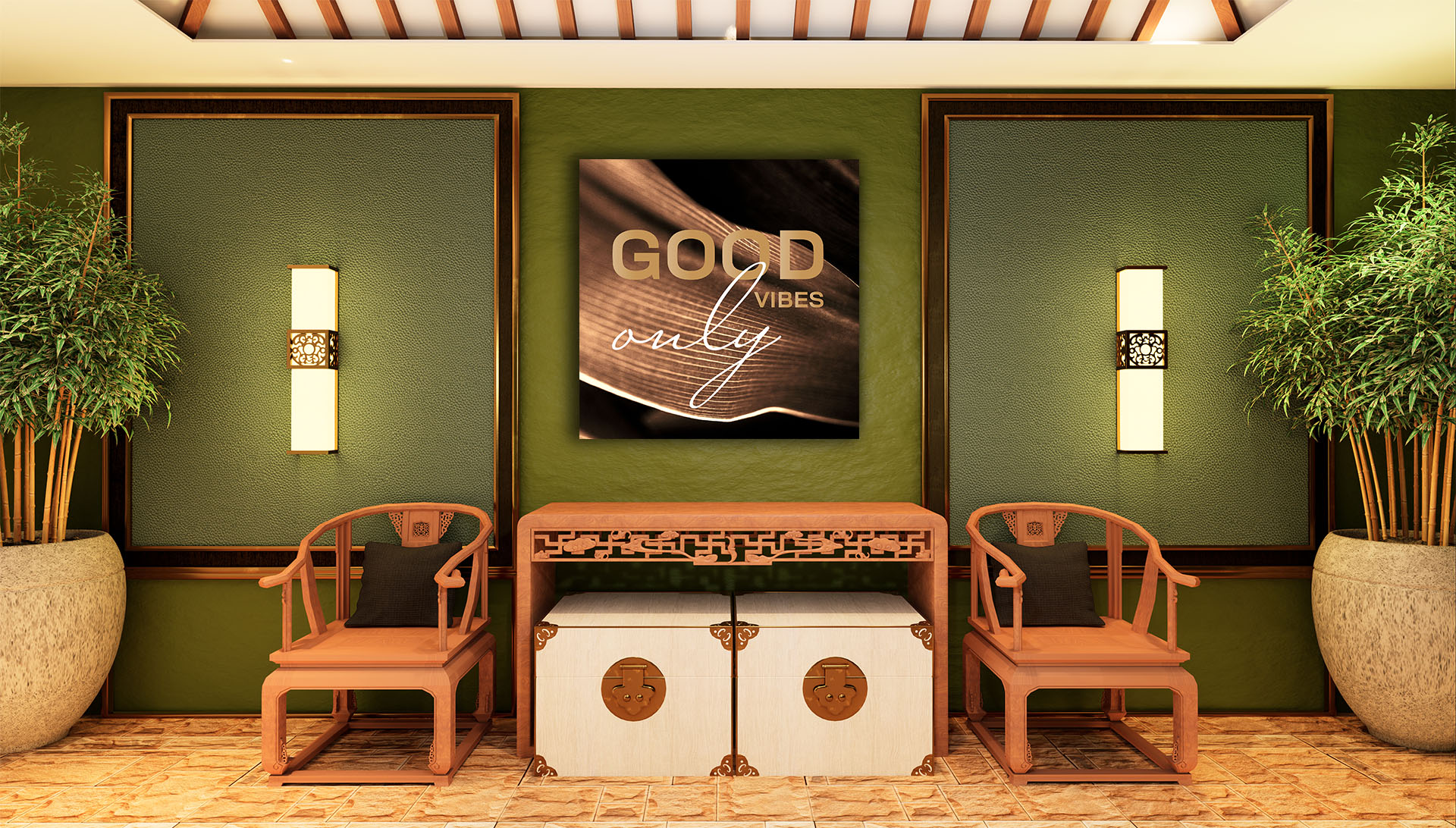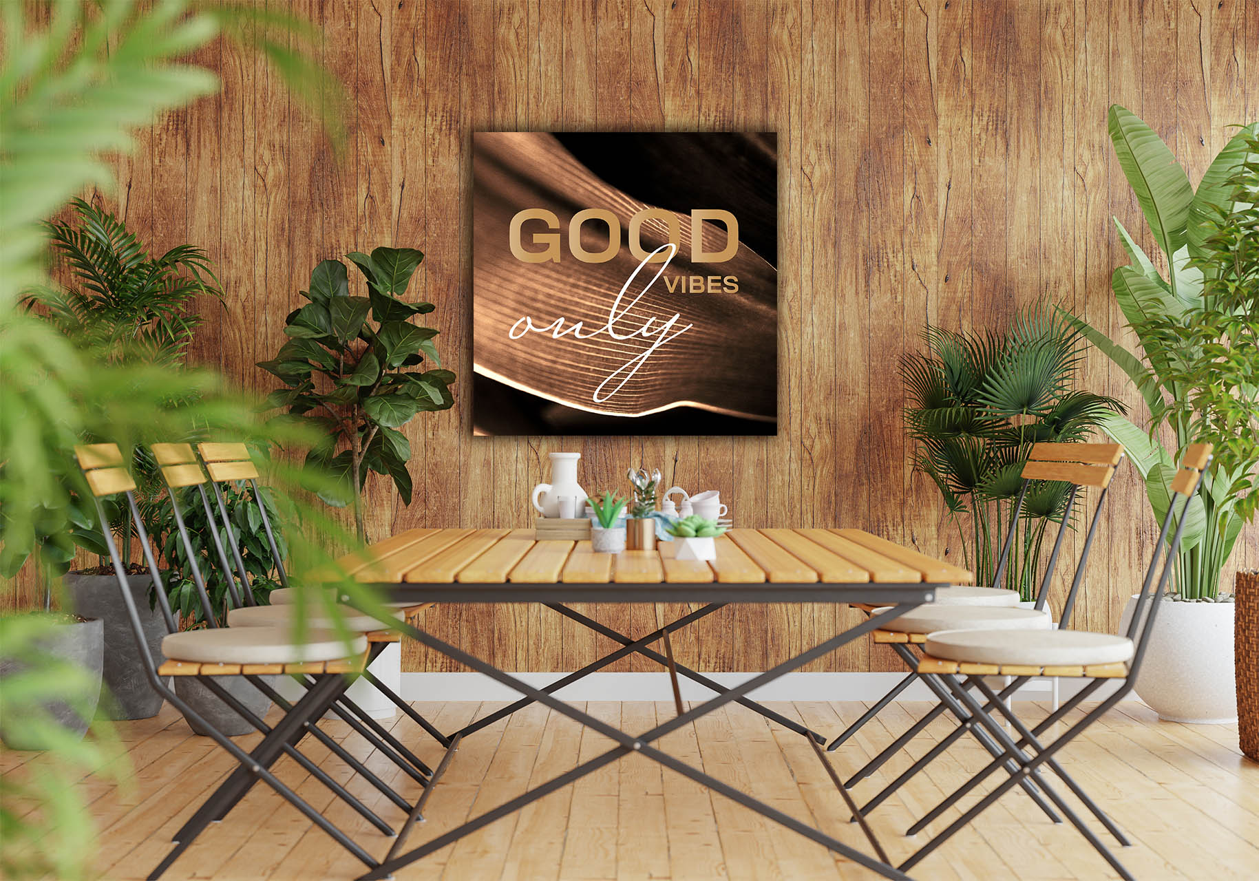 Damit dieses Motiv perfekt wirkt, empfehlen wir Ihnen für das Wandbild Good vibes only das Material Acrylglas.