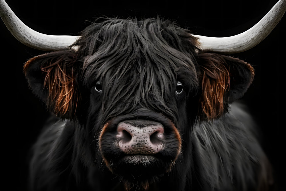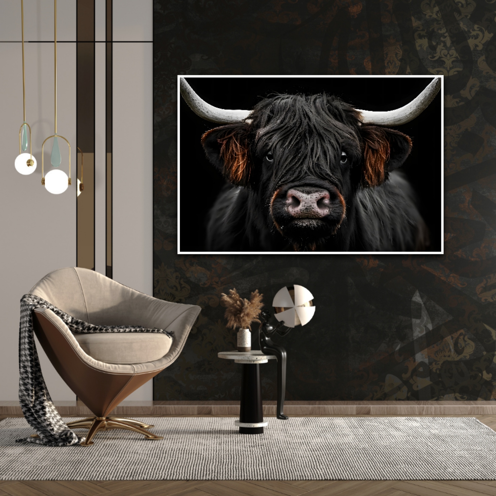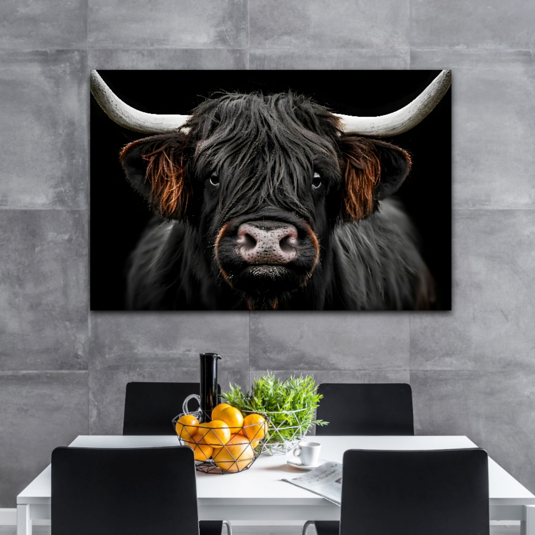 Begeben Sie sich auf eine Reise in die schottischen Highlands und holen Sie sich das eindrucksvolle Wandbild Highlander No.2 von Sabine Schiebofski in Ihre vier Wände! Dieses kunstvolle Portrait eines schwarzen Schottischen Hochlandrinds auf dunklem Hintergrund zeigt das Tier mit seinen imposanten Hörnern.