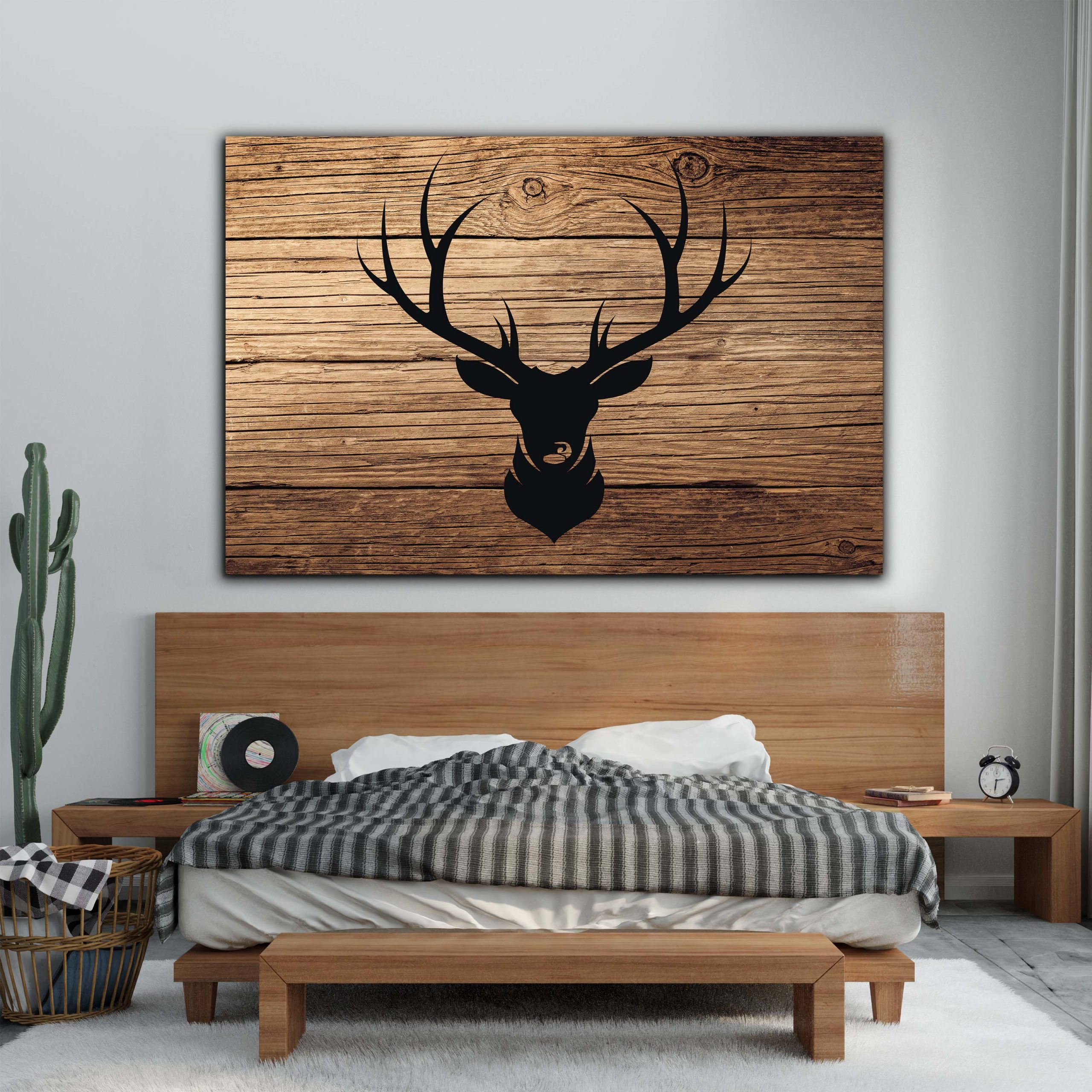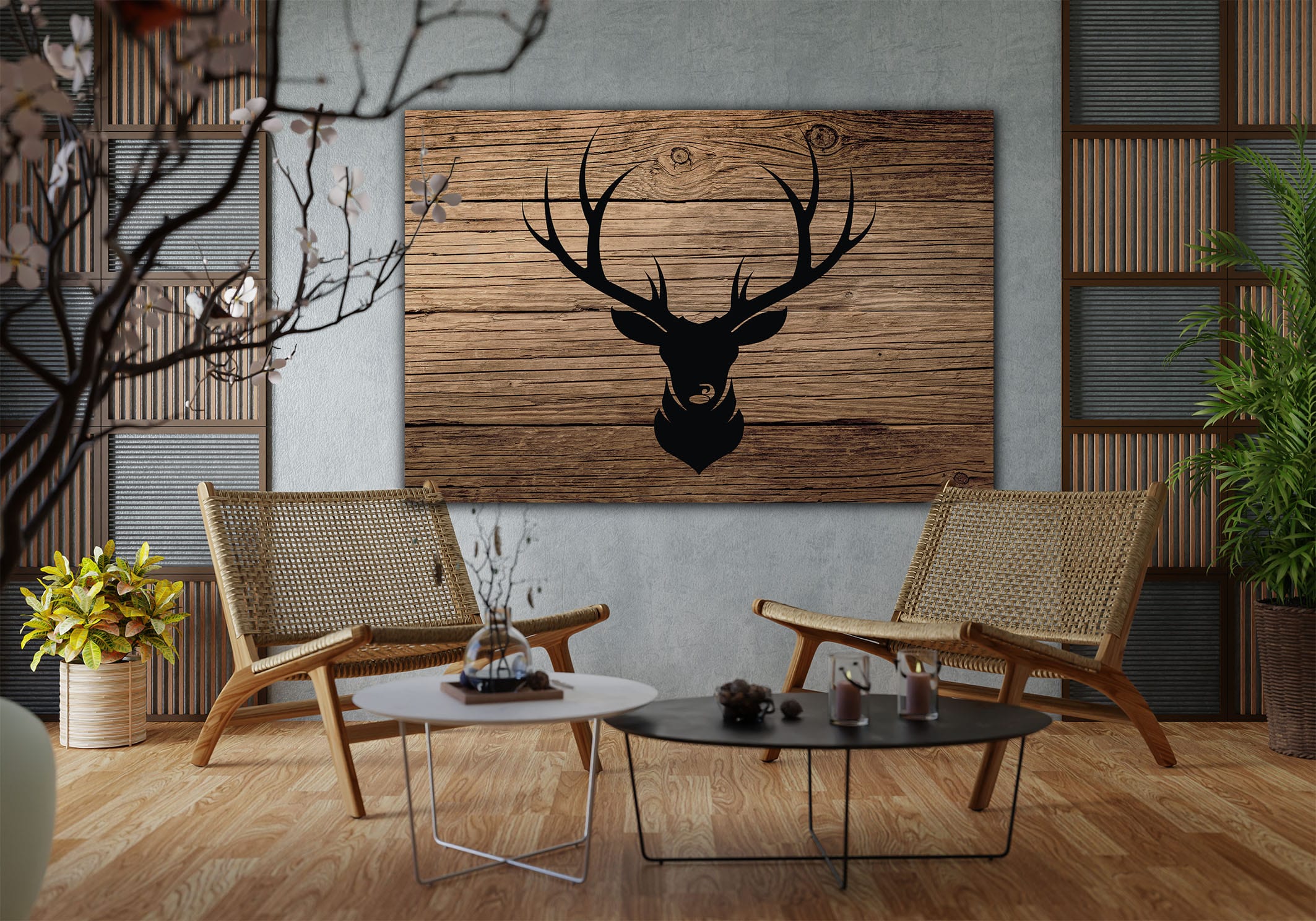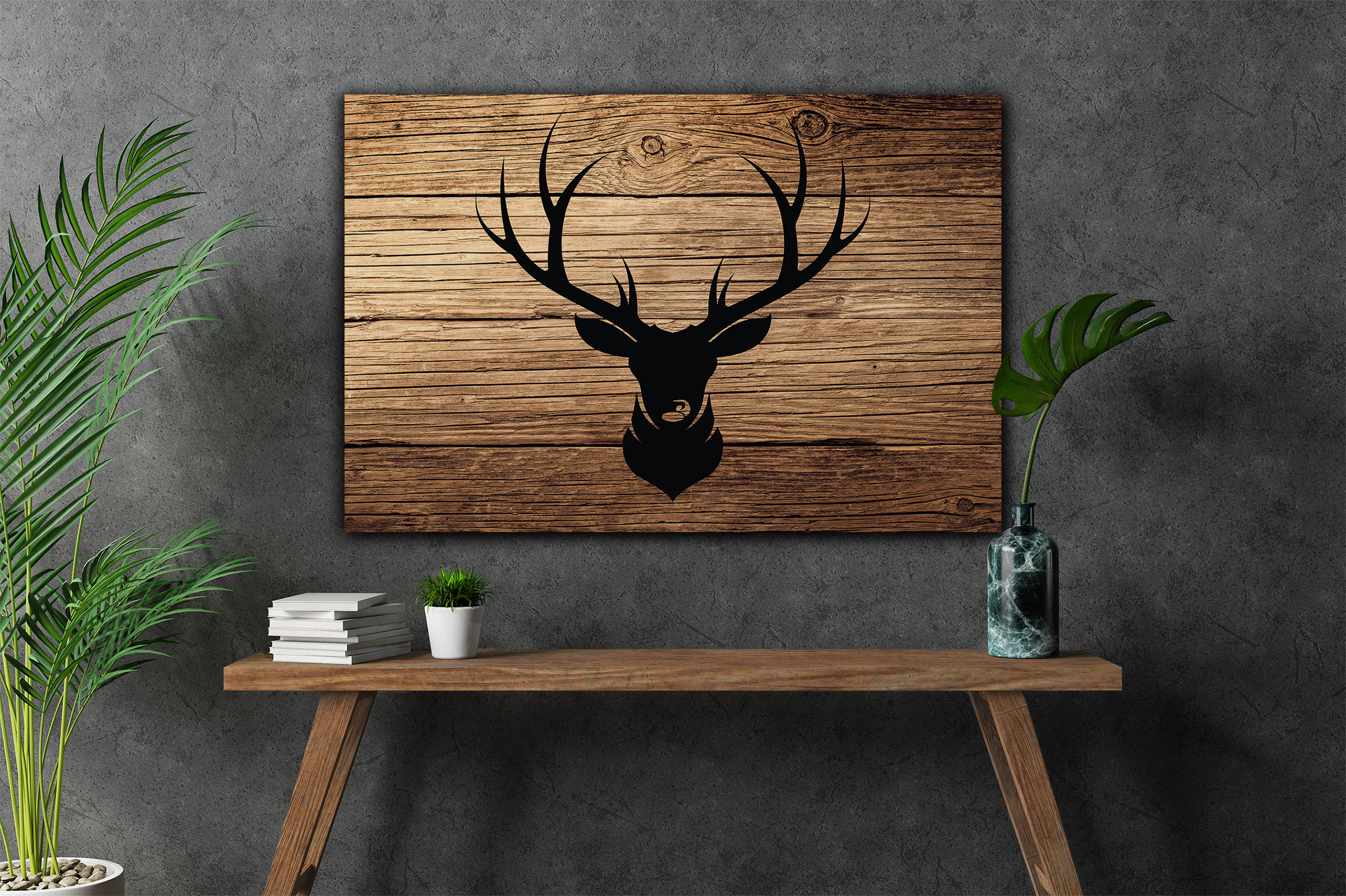 Sind Sie ein echter Fan vom dem rustikalen Einrichtungsstil eines Landhauses? Mögen Sie Wild, wollen sich aber keine echten Hirschgeweihe oder Köpfe an die Wand hängen? Dann haben wir für Sie eine passende Alternative. Mit dem Wandbild Hirschsilhouette auf Holz holen Sie sich den Charme einer alten Jagdhütte nach Hause – ganz ohne echte Tiere. Die Holzstruktur ist auf dem Wandbild ganz deutlich zu erkennen. Die schwarze Hirschsilhouette mit dem imposanten Geweih macht aus dem Wandbild ein besonderes Highlight.
