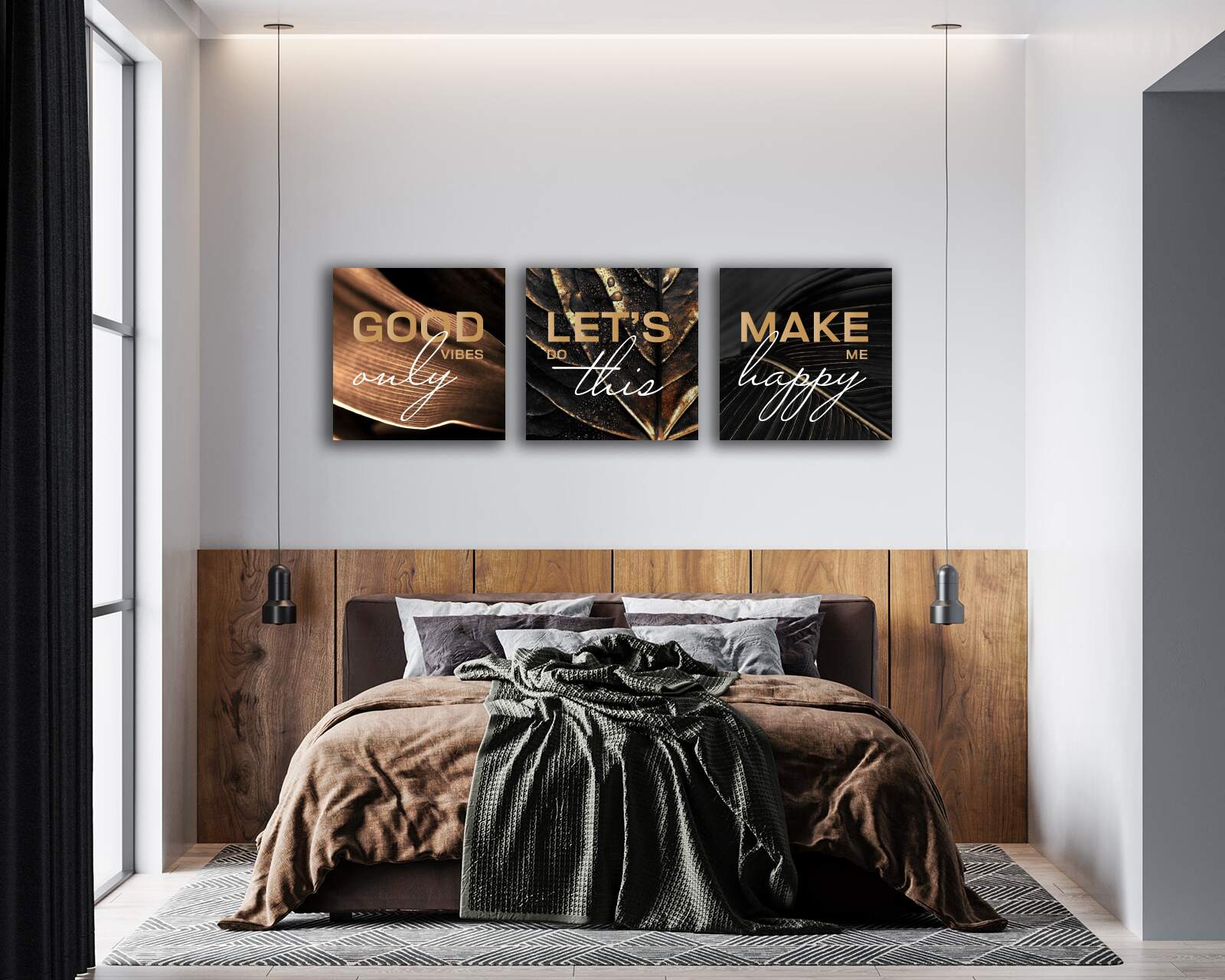 Die goldenen Töne des quadratischen Wandbildes Let’s do this geben dem Motiv einen edlen Charakter. Der Stil des Wandbildes ist modern und abstrakt. Dieses moderne Motiv wirkt einzeln als Hingucker und auch als Teil einer modernen Bilderwand. Dieses farbintensive und kontrastreiche Wandbild entfaltet seine besondere Wirkung auf einer Wand in einer zurückgenommenen, ruhigen Farbgestaltung, zum Beispiel im Wohnzimmer, Schlafzimmer, Flur oder Esszimmer. Sie brauchen genügend Raum vor dem Bild, damit Sie es mit etwas Entfernung betrachten können.