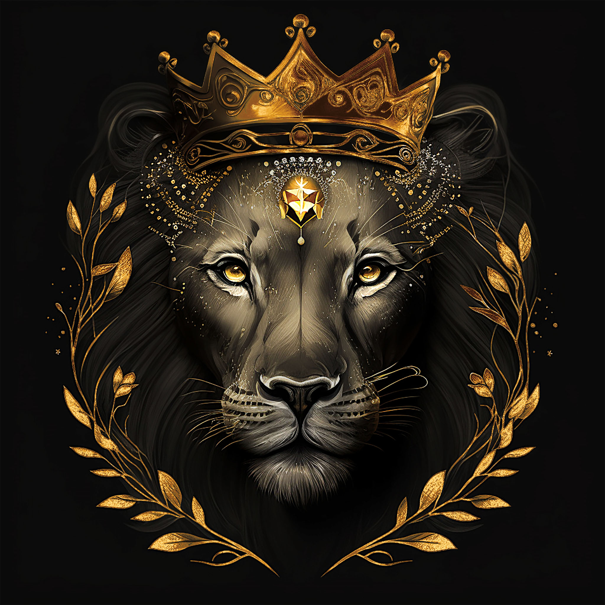 Bringen Sie mit dem Lion Queen Wandbild von Flowers and Macro majestätische Eleganz in Ihre Räumlichkeiten! Das beeindruckende Kunstwerk zeigt einen königlichen weiblichen Löwenkopf, der von einer goldenen Krone und zwei Lorbeerzweigen umrahmt wird. Der schwarze Hintergrund verstärkt die Kontraste und verleiht dem Wandbild eine tiefgründige Wirkung.