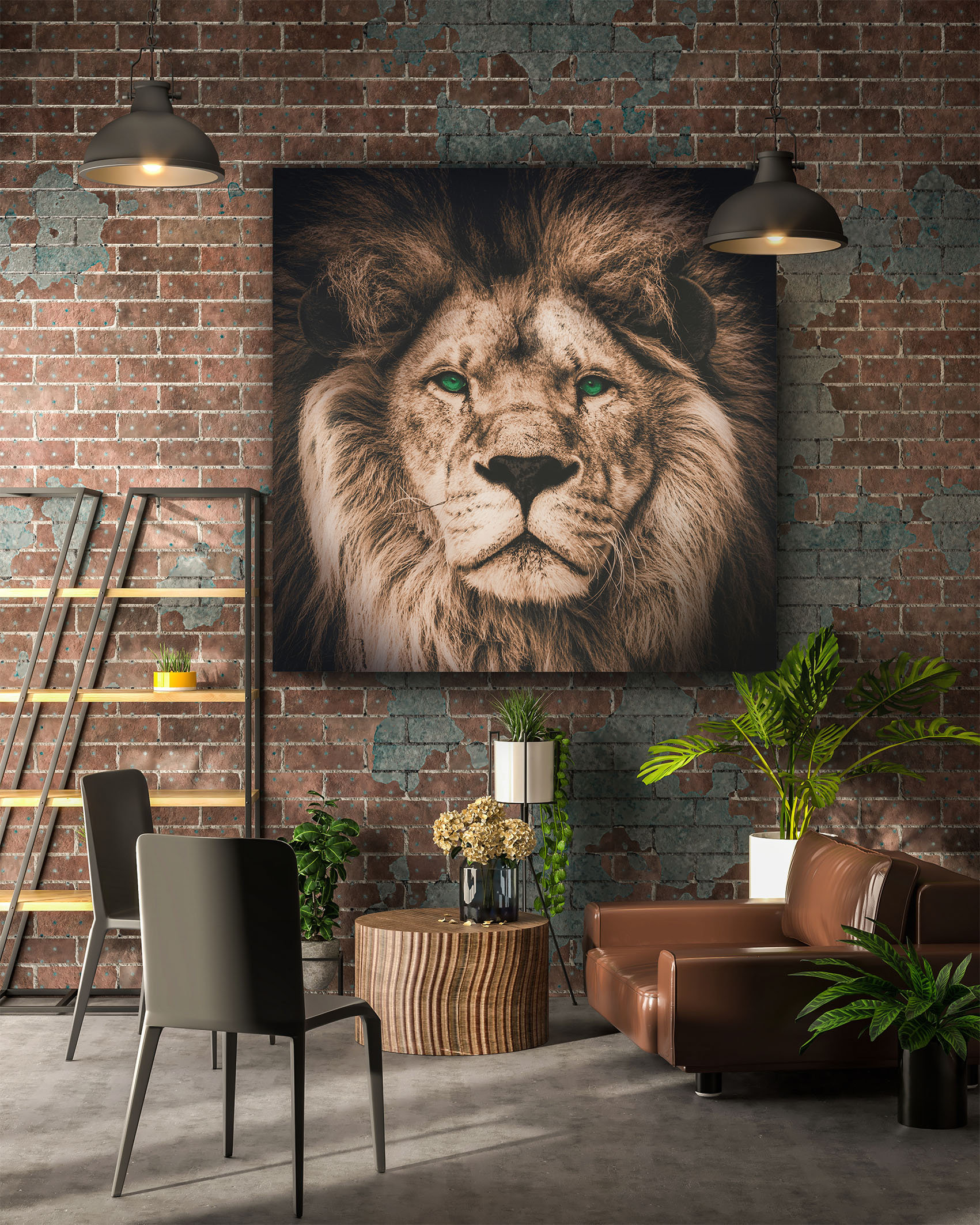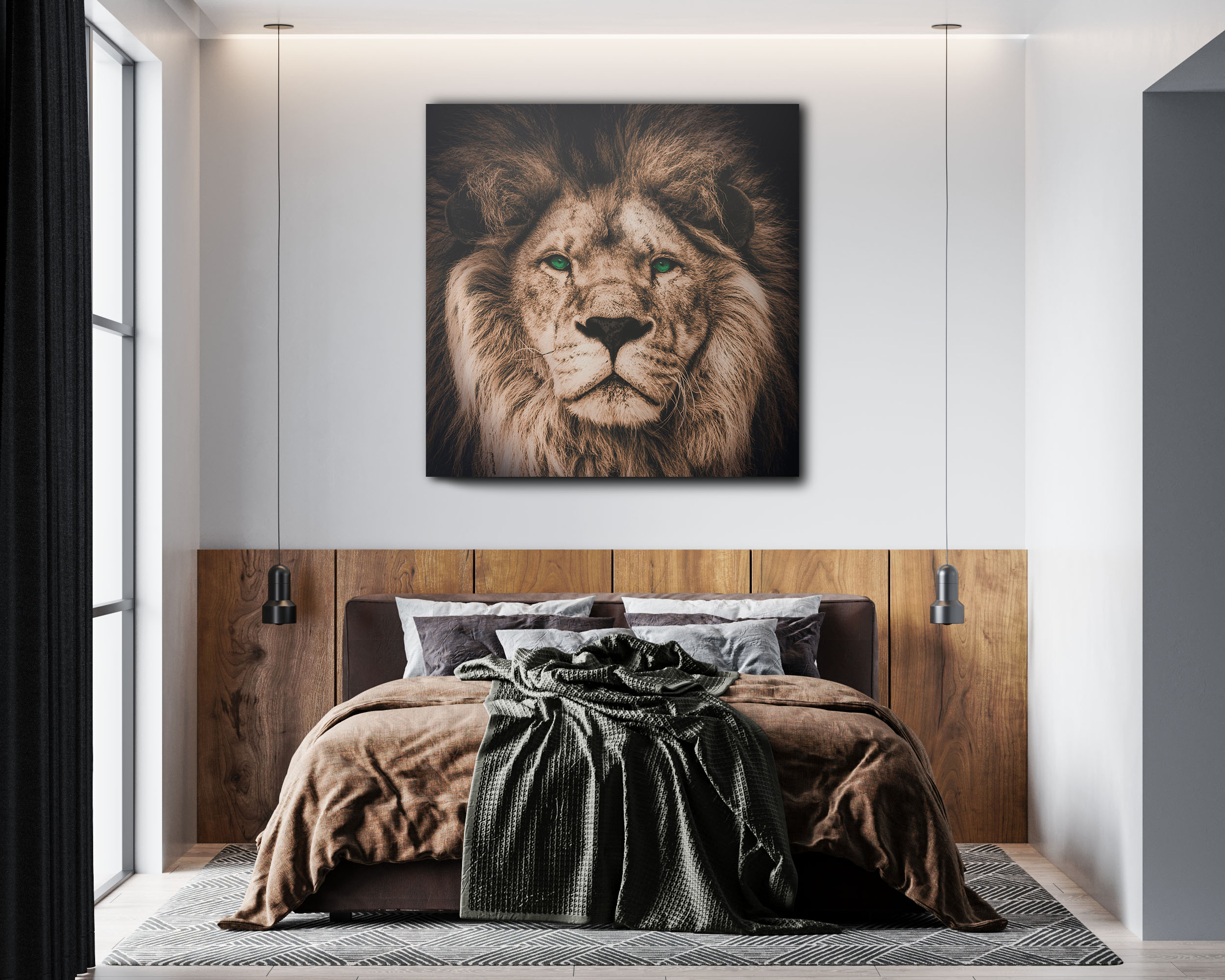 Das tolle Wandbild Löwe mit grünen Augen in der Kategorie Tiere & Natur ist in neutralen Brauntönen gehalten. Und trotzdem ist der Löwe beeindruckend und kraftvoll in Szene gesetzt. Ein überwältigender Schnappschuss mit einem magischen Blick. Können Sie wegschauen oder sind Sie genauso fasziniert? Das Wandbild passt perfekt zu einem neutralen Wohnstil, wie Wohnzimmer, Schlafzimmer Esszimmer oder Flur, genauso wie zu Räumen mit Loftcharakter. Dieses rahmenlose Wandbild wirkt immer pur und modern und bildet einen effektvollen Bruch zu klassischen Interiors. Der Löwe zieht einen direkt in den Bann.