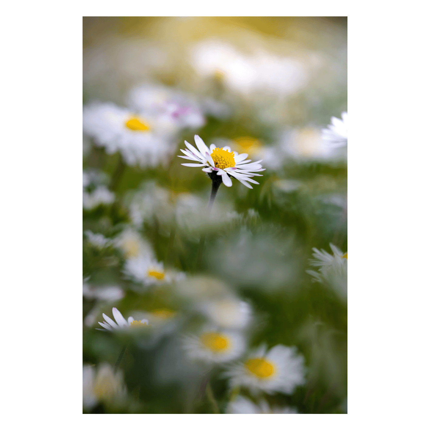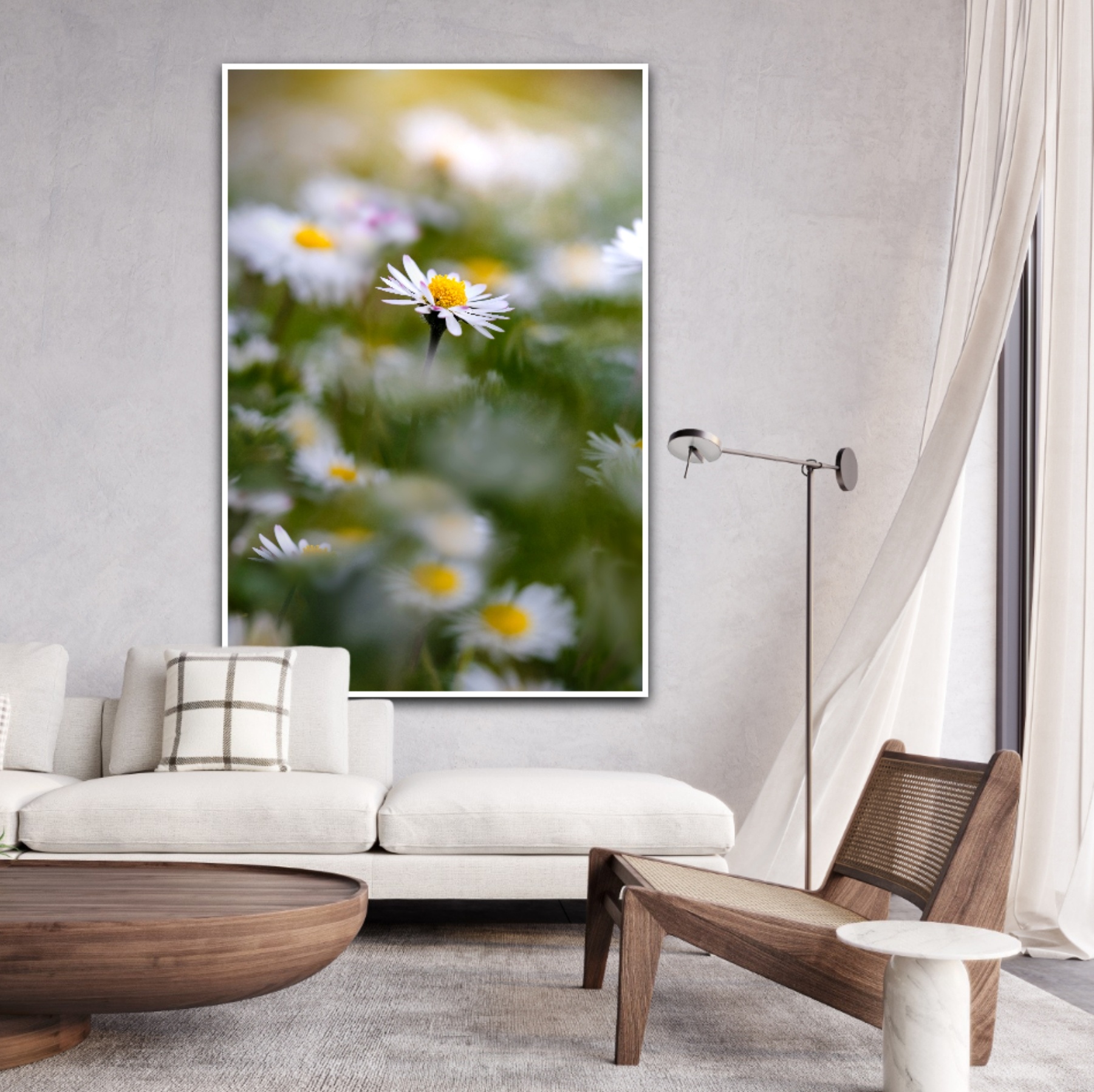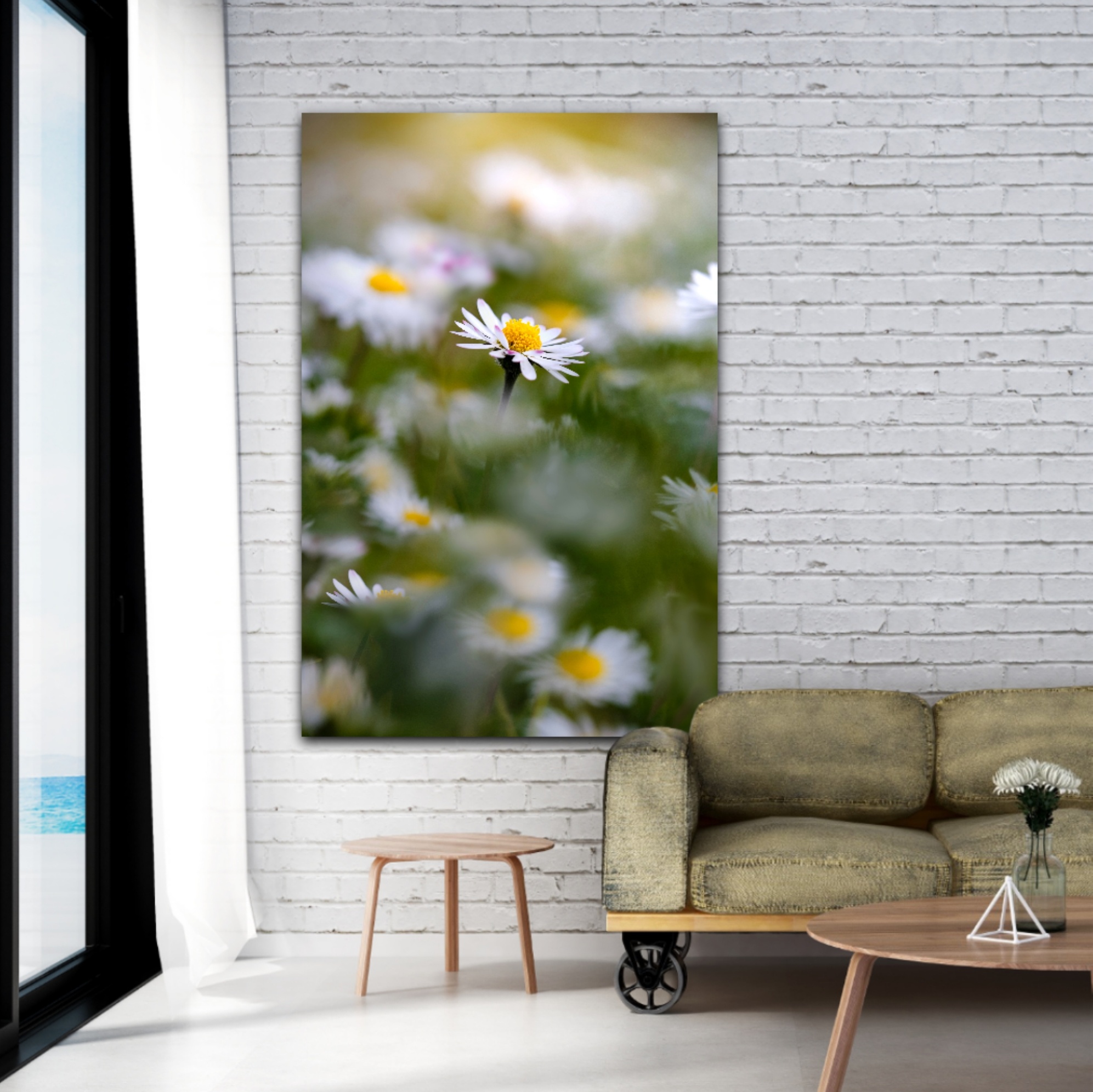 Das Hauptmotiv des Wandbildes ist eine üppige Wiese, die mit zarten Gänseblümchen übersät ist. Jedes Gänseblümchen ist mit verschiedenen Schärfestufen dargestellt, wodurch ein faszinierender Effekt erzielt wird. Von den klar fokussierten Blüten im Vordergrund bis hin zu den sanft verschwommenen Blumen im Hintergrund – jedes Detail dieses Kunstwerks wurde mit großer Sorgfalt und Liebe zum Detail gestaltet.