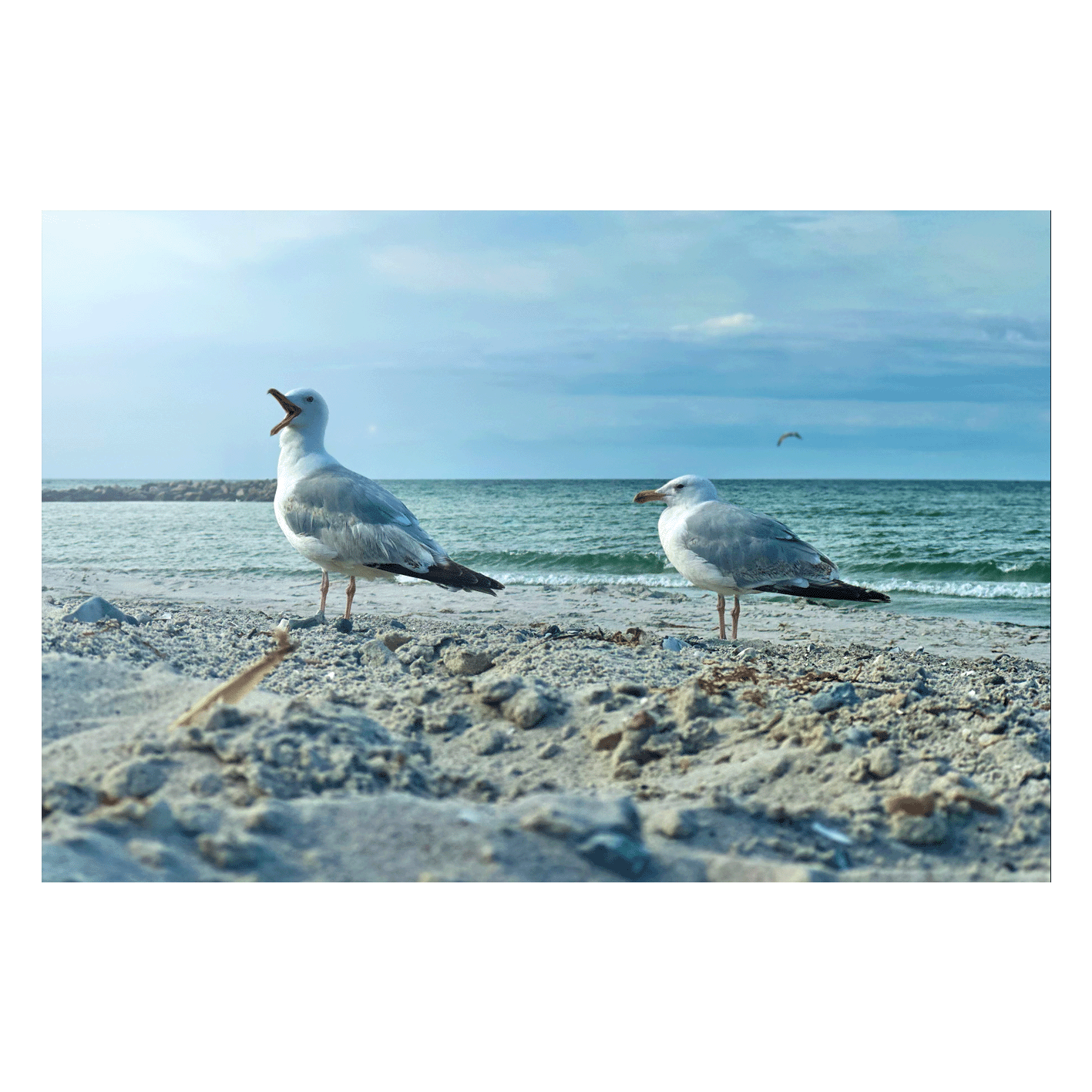 Genießen Sie den Anblick des kristallklaren Meeres im Hintergrund, während eine der Möwen ihren Schnabel weit öffnet, als ob sie einen melodischen Ruf in die Weite des Horizonts senden würde. Die Kombination aus dem sanften Rauschen der Wellen und dem Anblick der Möwen schafft eine Atmosphäre der Ruhe und Gelassenheit.