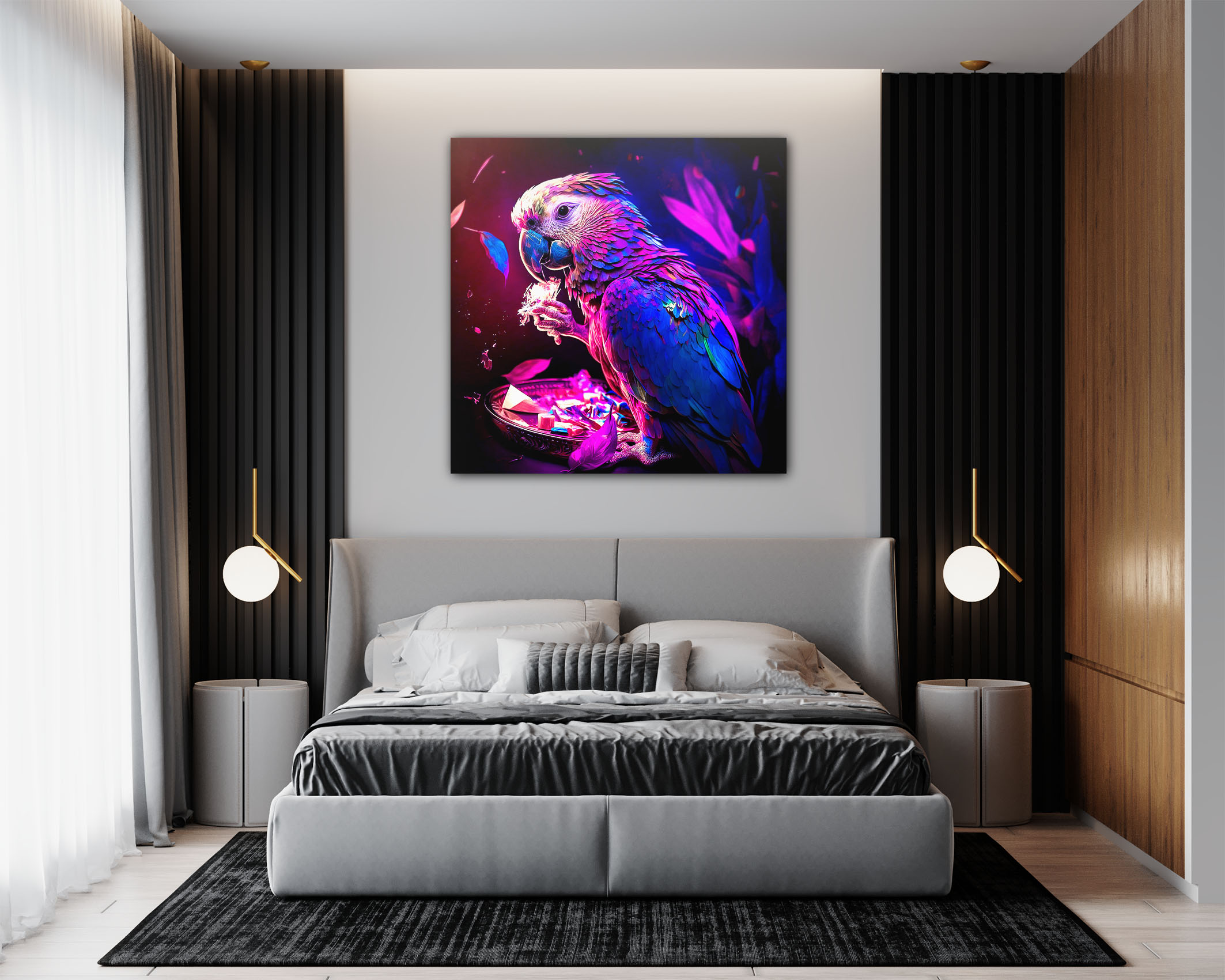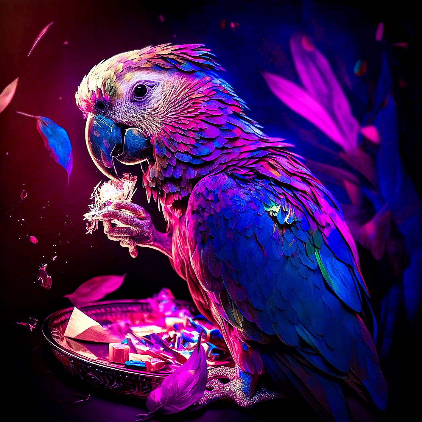 Das Wandbild Neon Bird No.2 von Flowers and Macro ist ein Kunstwerk, das die Sinne anregt und die Fantasie beflügelt. Es zeigt einen majestätischen Vogel in strahlenden Neonfarben, der vor einem silbernen Teller steht und einen geheimnisvollen Kristall in seiner Kralle hält.