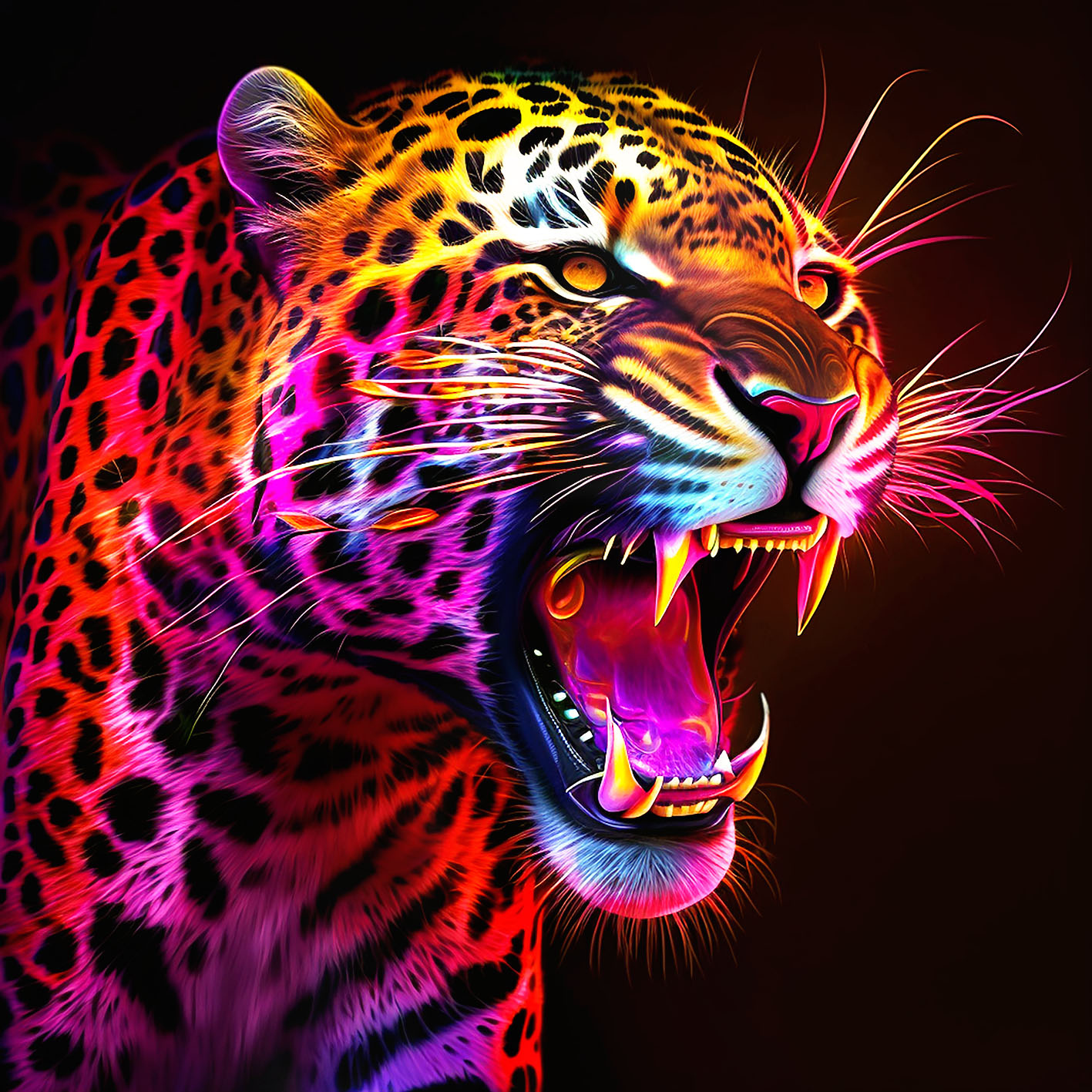 Erwecken Sie Ihr Zuhause mit dem Neon Cheetah Wandbild von Flowers and Macro zum Leben! Dieses atemberaubende Kunstwerk zeigt eine atemberaubende Illustration eines Gepards, der in leuchtenden Neonfarben dargestellt ist. Die kräftigen Farben erzeugen einen starken Kontrast zum dunklen Hintergrund und lassen das Motiv förmlich von der Wand springen.