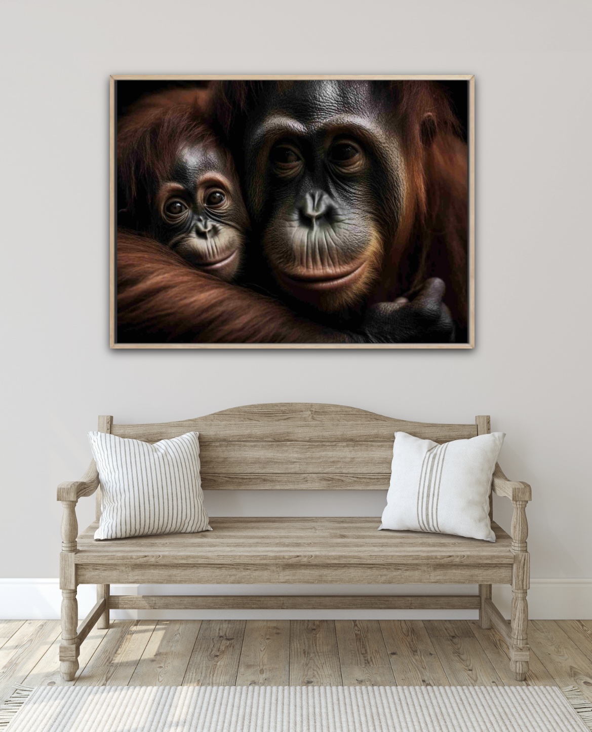 Das Wandbild Orang Utan fängt auf zauberhafte Weise den innigen Moment einer Mutter mit ihrem Kind ein. Diese herzerwärmende Darstellung bietet nicht nur eine visuelle Attraktion, sondern schafft auch eine tiefere emotionale Verbindung, die sowohl Erwachsene als auch Kinder anspricht. Mit seiner liebevollen Botschaft und seiner Ästhetik ist dieses Bild eine Bereicherung für jedes Zuhause.