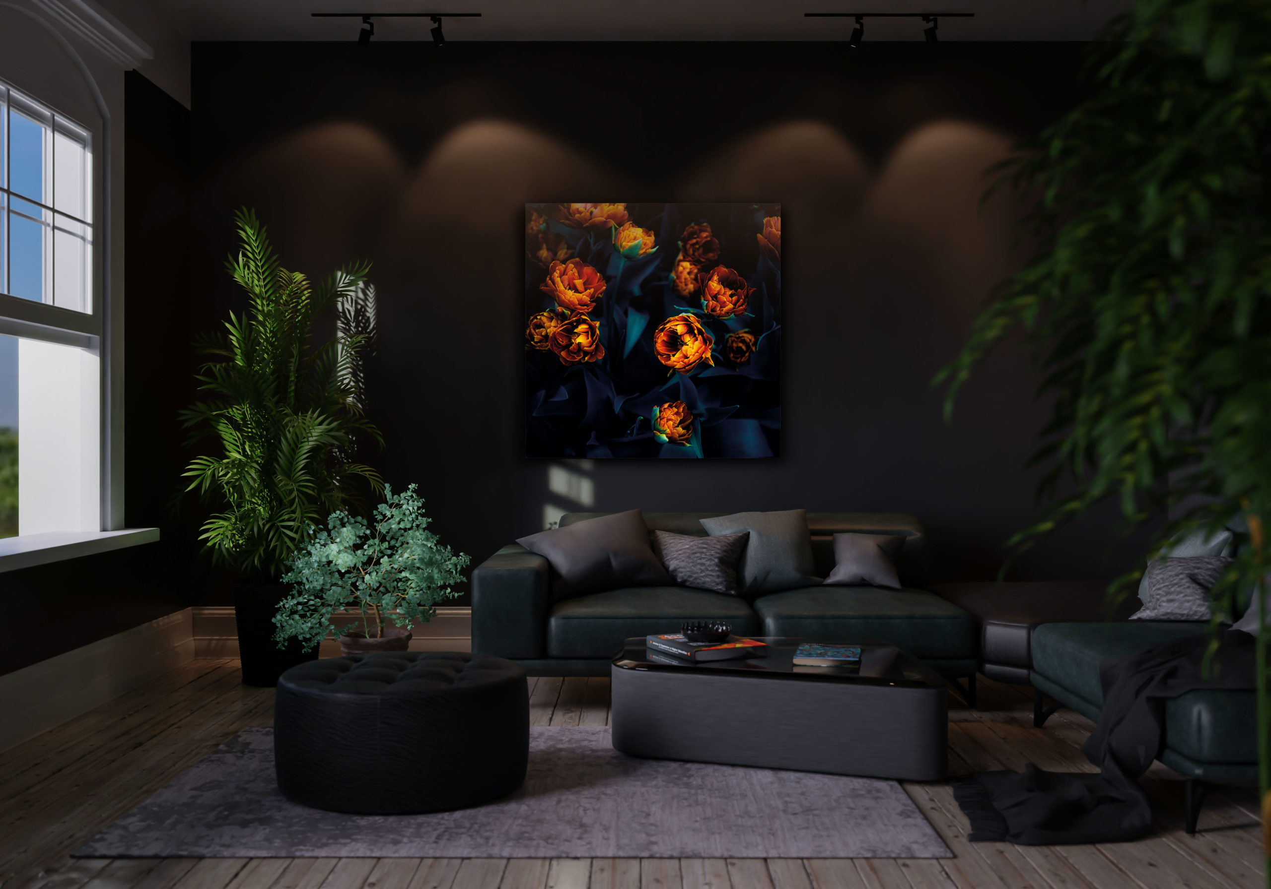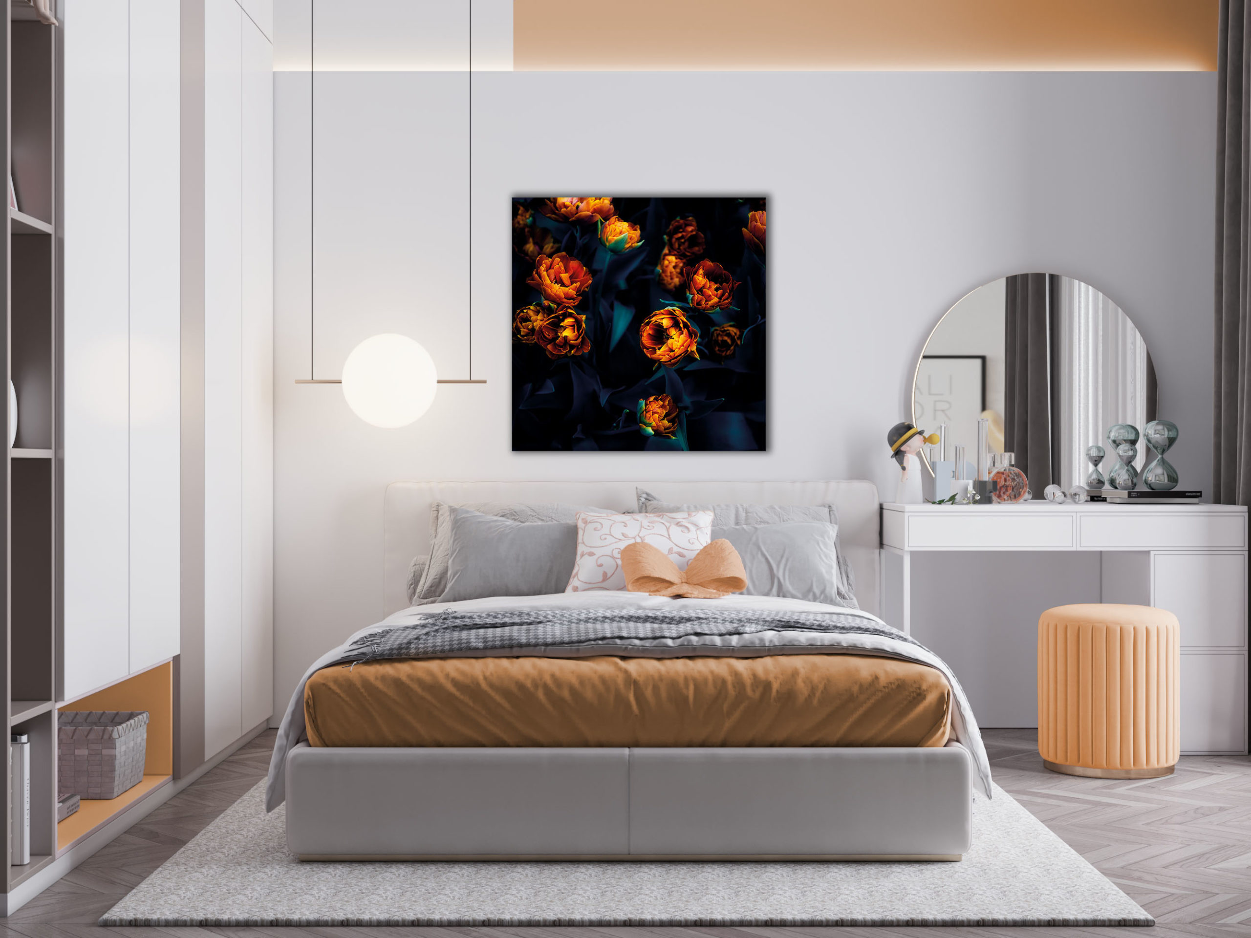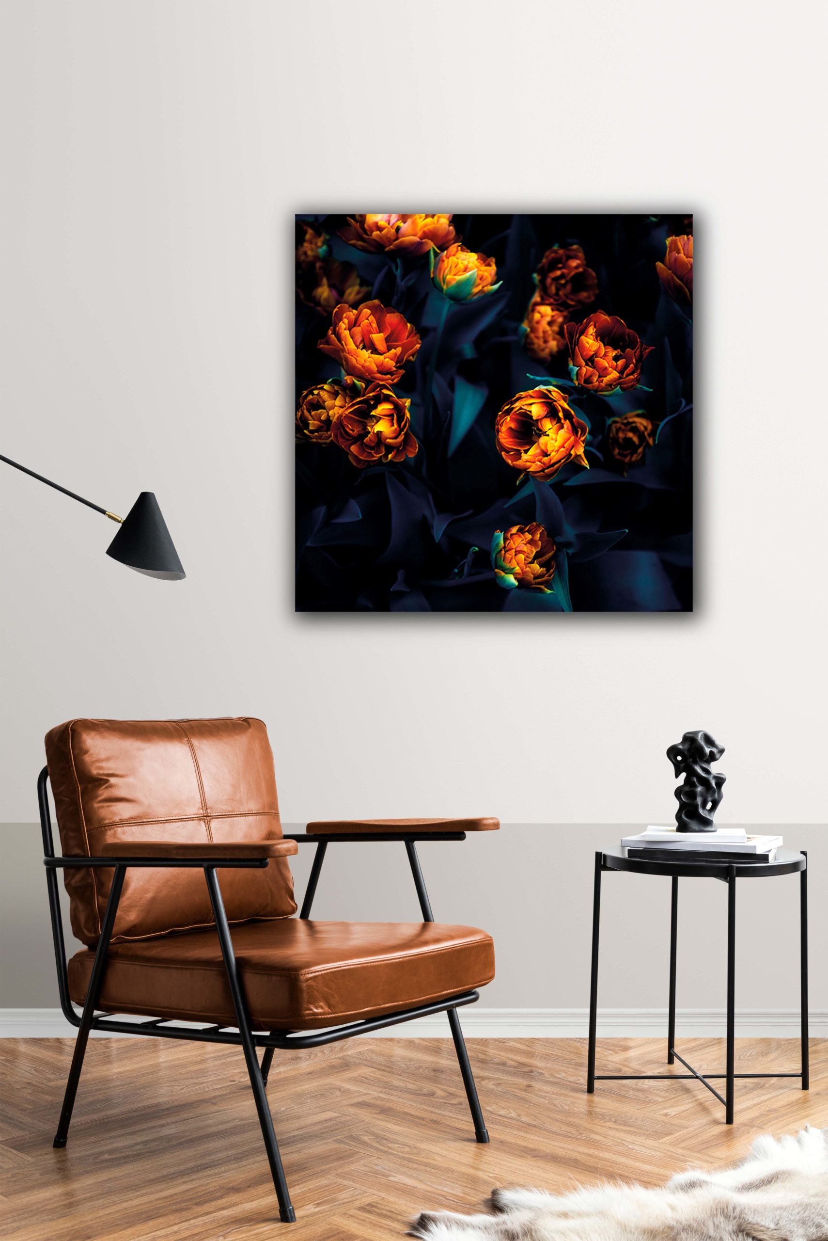 Die Pfingstrose ist ein Symbol für Reichtum, Heil, Heilung und Schönheit. Dieses wunderschöne Wandbild Pfingstrose Orange auf Schwarz zeigt eine Nahaufnahme eines bezaubernden Blumenstraußes. Die orangefarbenen zarten Blüten der Pfingstrose wirken besonders intensiv, da die Blätter und Stiele in zurückgenommenen dunklen Farben gehalten sind. Bilder mit Blumenmotiven gehören zu den beliebtesten Wanddeko-Elementen. Besonders Blumenfreunde und Freunde von Natur und Landschaften wissen diese Schönheit zu schätzen. Das Wandbild Pfingstrose passt hervorragend in ein helles Schlafzimmer oder Wohnzimmer.