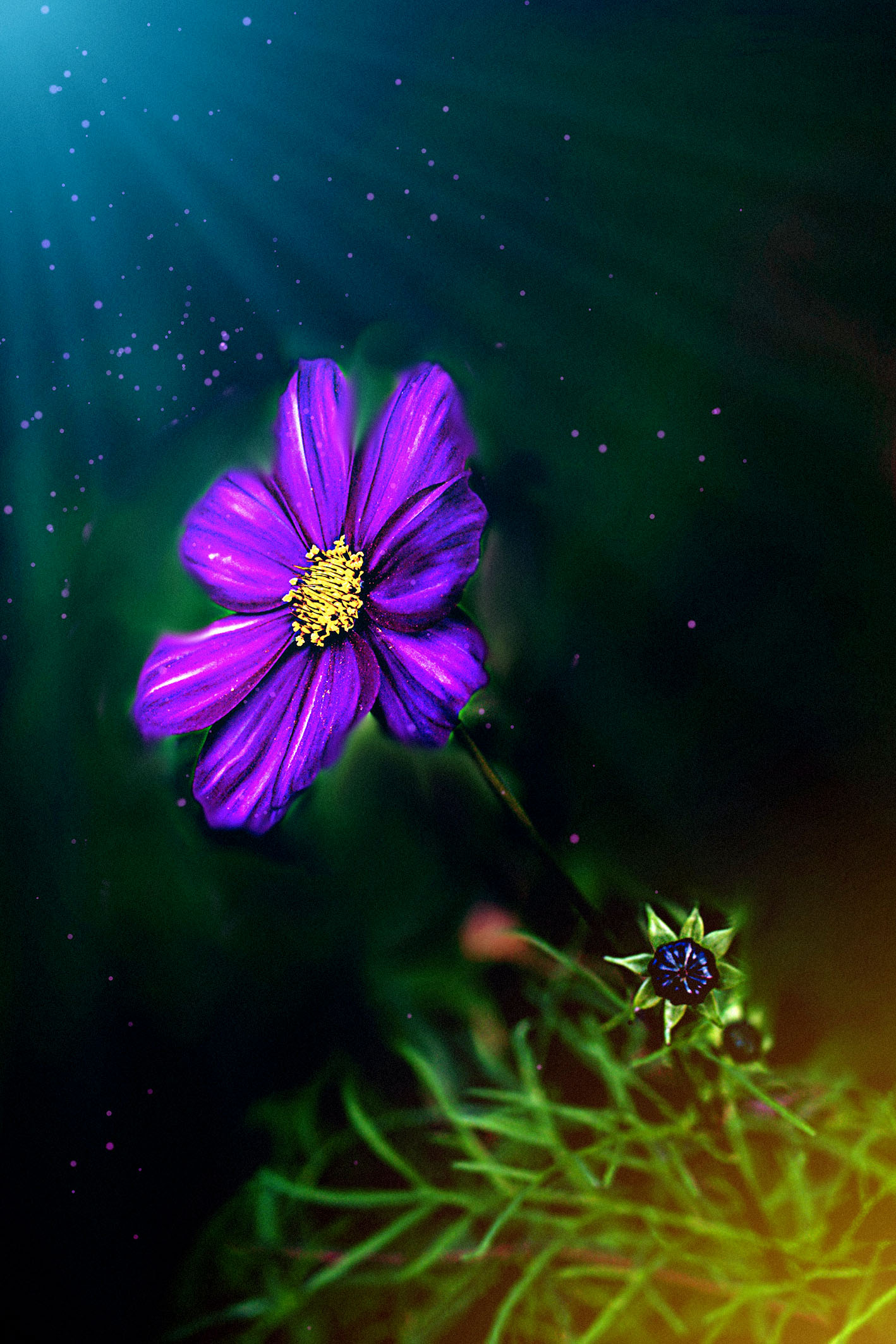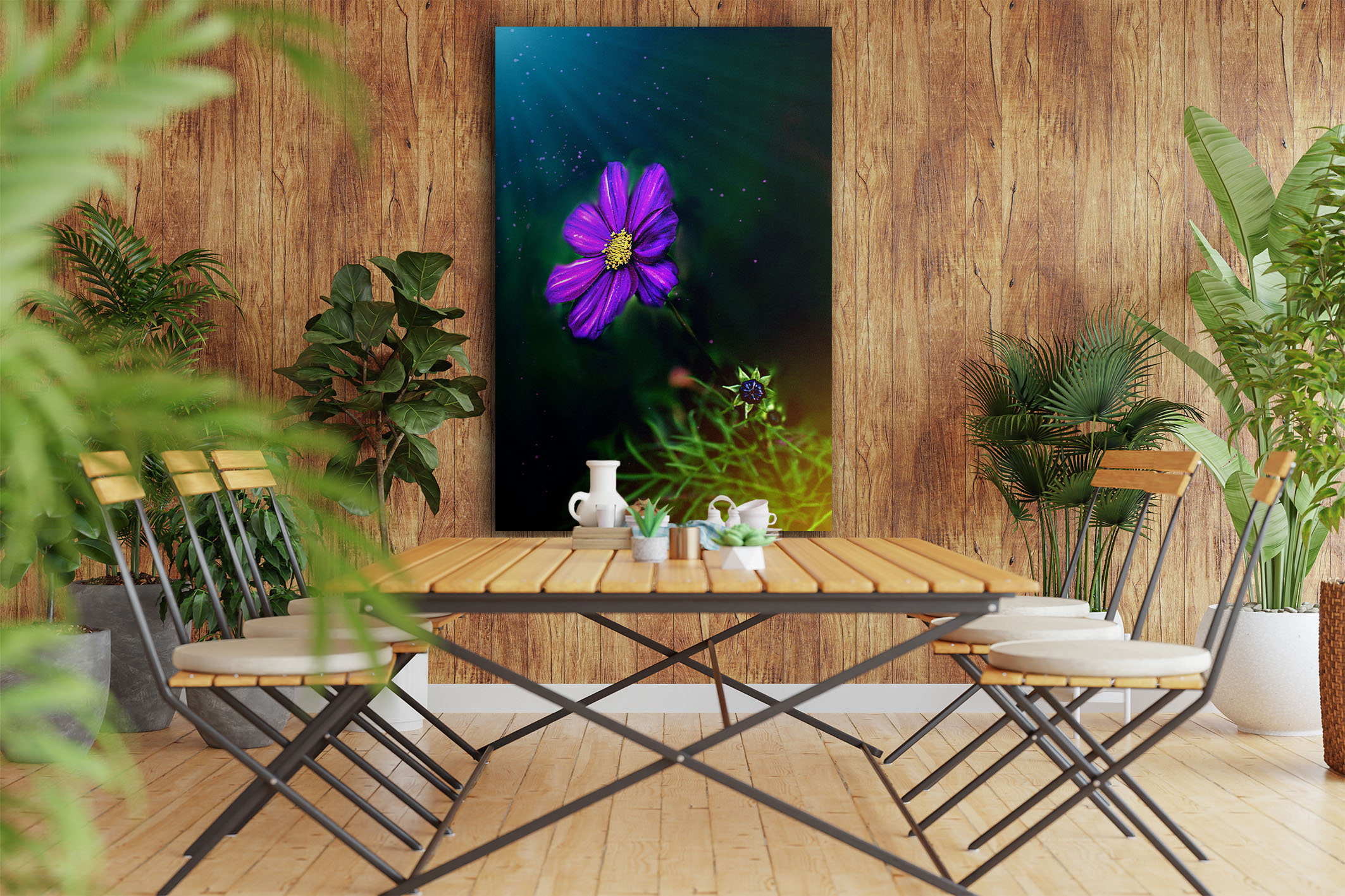 Das Wandbild Purple Heaven von Flowers and Macro zeigt eine atemberaubende violette Blume, die von magischen Lichtstrahlen durchdrungen wird. Die kleinen, violetten Partikel, die über das Bild fliegen, verleihen diesem Kunstwerk eine besondere Lebendigkeit und Tiefe. Der dunkle Hintergrund sorgt für einen atemberaubenden Kontrast, der die Schönheit der Blume hervorhebt.
