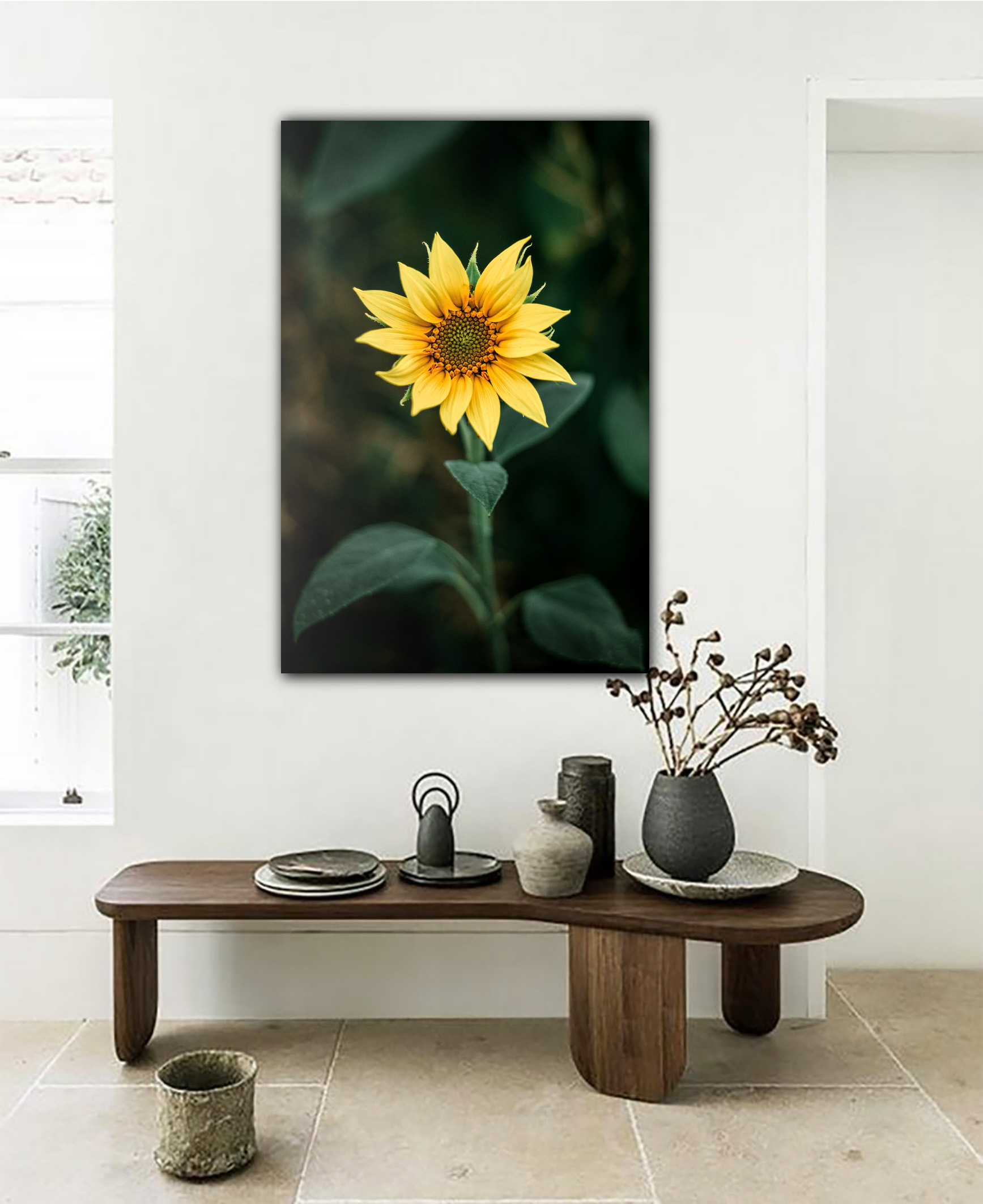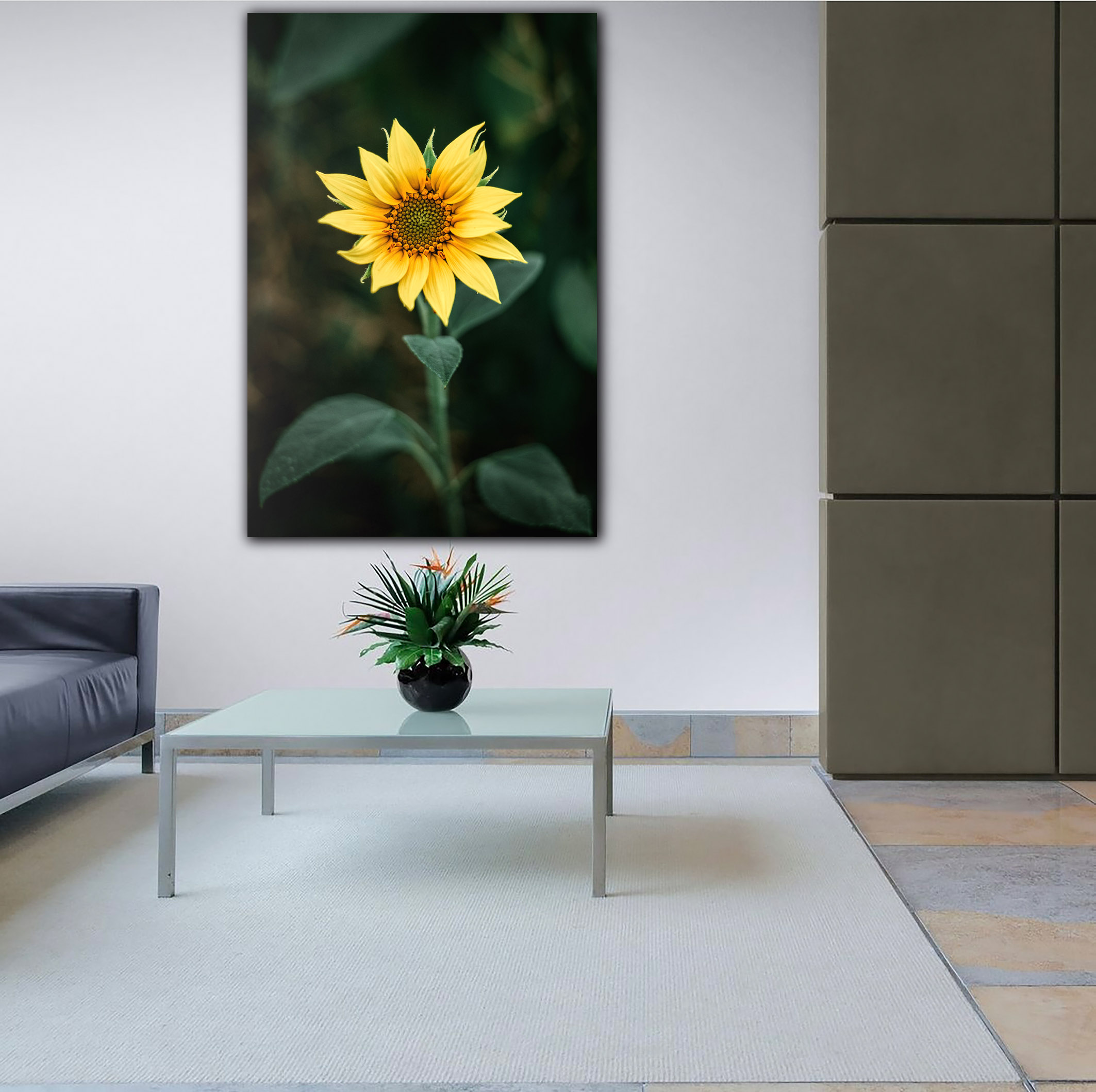 Erwecken Sie die Natur in Ihrem Raum zum Leben mit dem faszinierenden Wandbild Radiant Sprout, festgehalten von der talentierten Fotografin Maja Pfab. Dieses außergewöhnliche Kunstwerk zeigt eine junge Sonnenblume in atemberaubender Frontalansicht, die mit ihrer strahlenden Schönheit den Betrachter verzaubert.