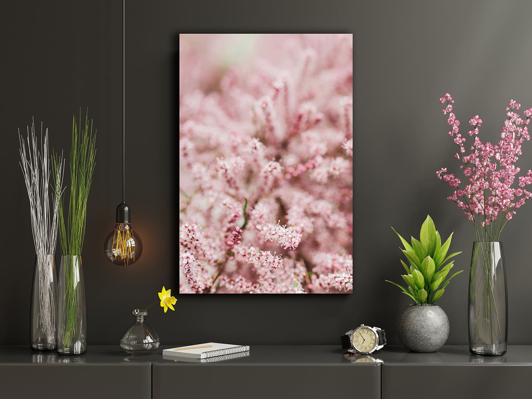 Das Wandbild Rosa Blüten wirkt besonders harmonisch in einer ruhigen, zurückgenommenen Wohnatmosphäre. Die zarten Rosatöne des Bildes passen perfekt zu einem eleganten Wohnstil. Kombinieren Sie das Wandbild Rosa Blüten mit nur ein paar wenigen Deko-Elementen, damit es seine volle Wirkung in Ihrem Wohnzimmer oder Flur entfalten kann.