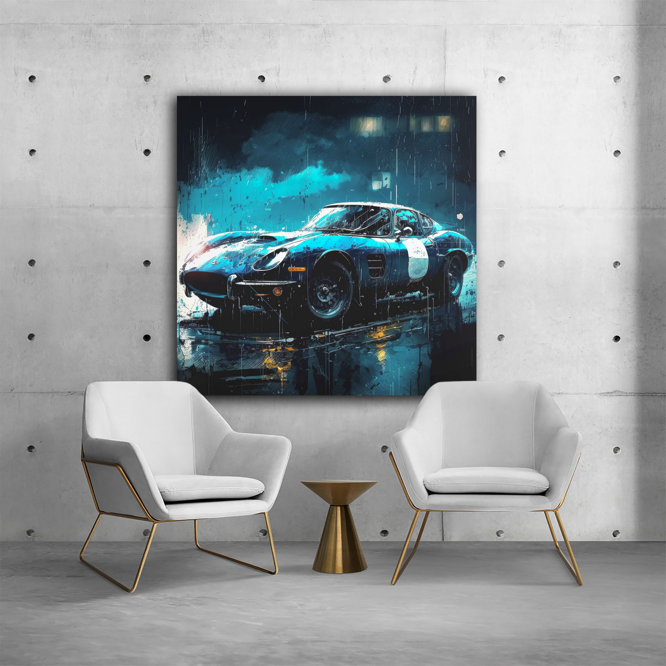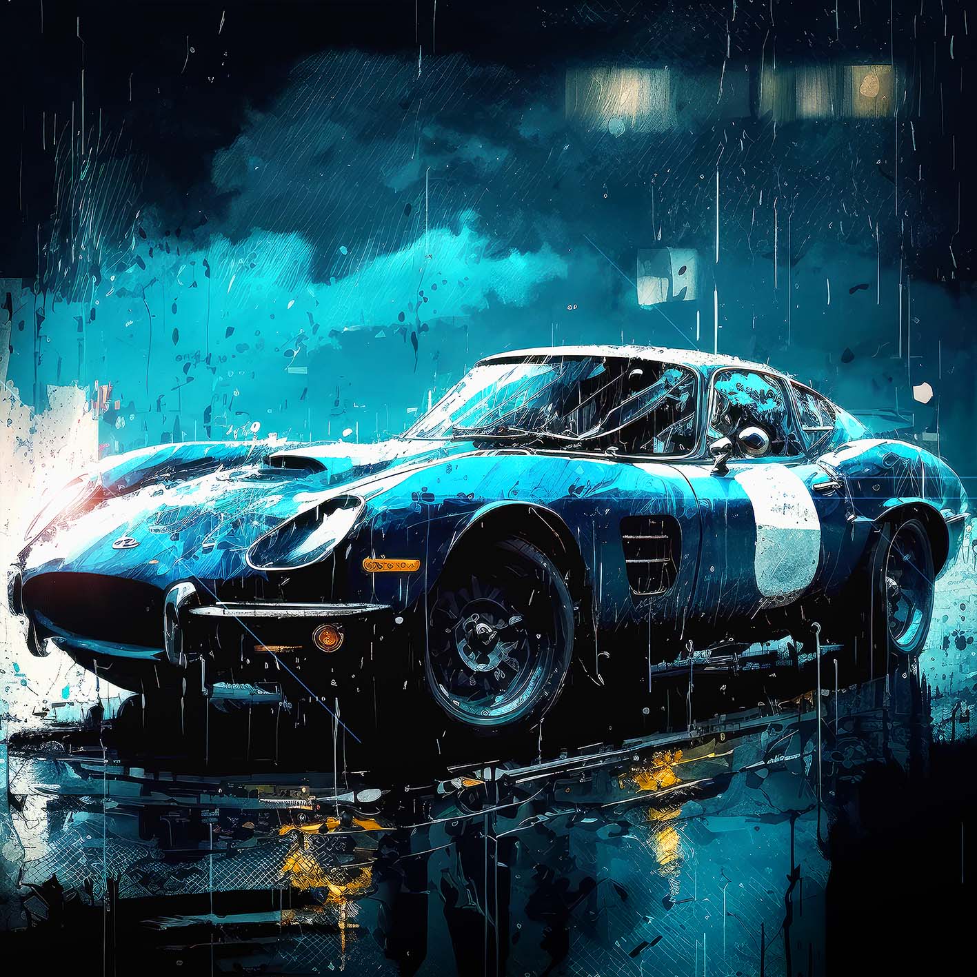 Wir präsentieren stolz das Wandbild Sportscar – ein beeindruckendes Kunstwerk von Claus Unterberg, das jeden Sportwagen-Liebhaber begeistern wird. Diese surreale Illustration zeigt einen atemberaubenden Sportwagen in der Nacht, umgeben von starkem Regen und nebelverhangenen Fenstern eines Wohnhauses im Hintergrund. Der nasse Boden reflektiert die Umgebung und gibt dem Bild eine zusätzliche Tiefe und Realität.
