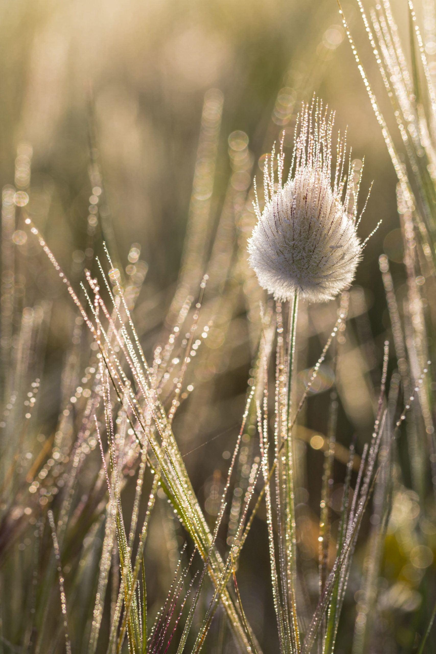 Das Bild zeigt eine wunderschöne Nahaufnahme von taubedeckten Gräsern. Für Romantik, Wärme und Sinnlichkeit im Wohn- oder auch Schlafzimmer sind botanische Fotografien die perfekte Wahl. Diese besondere Fotokunst ist daher eine wunderbare Ergänzung für ein behagliches Zuhause.