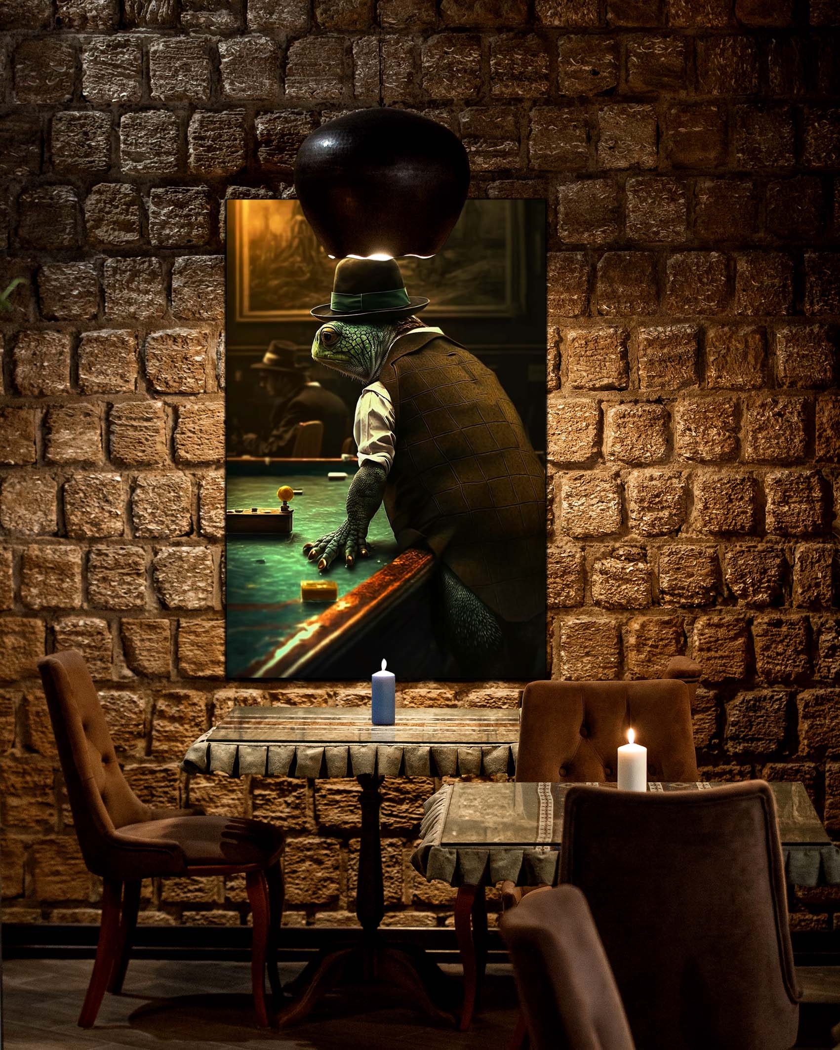 Das Wandbild The Brain aus der Wandbildkollektion “Turtle Gang” von Flowers and Macro ist eine einzigartige und faszinierende Ergänzung für jedes Zuhause oder Büro. Es zeigt eine Schildkröte mit Hut und Weste, die sich in einer Bar über einen Billardtisch lehnt – ein Bild, das sowohl charmant als auch geheimnisvoll ist.