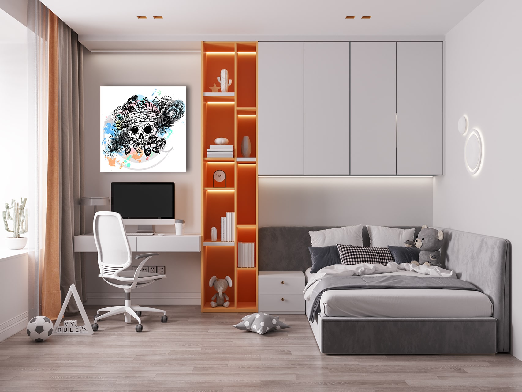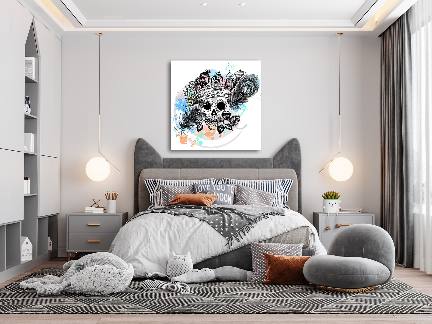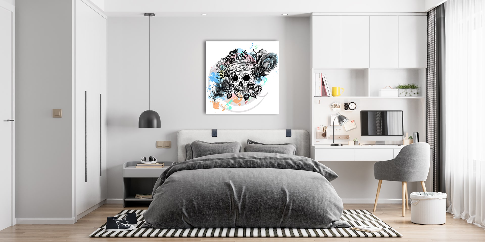 Die Welt ist so schön und individuell. Lassen Sie Ihre Wände mit tollen, individuellen Bildern erstrahlen. Mit dem Wandbild Totenkopf Pirat Quadratisch bringen Sie ein Stück abstrakte Kunst in Ihr Zuhause. Das Bild besticht mit seiner schwarz-weiß Zeichnung eines Totenkopfes. Im Hintergrund wirken bunte Farbtupfer für das besondere Etwas. Blumen und Federn machen aus dem Totenkopf ein weiches, liebevolles Symbol. In verschiedenen Kulturen hat der Totenkopf eine andere Bedeutung. Für was steht der Totenkopf bei Ihnen?