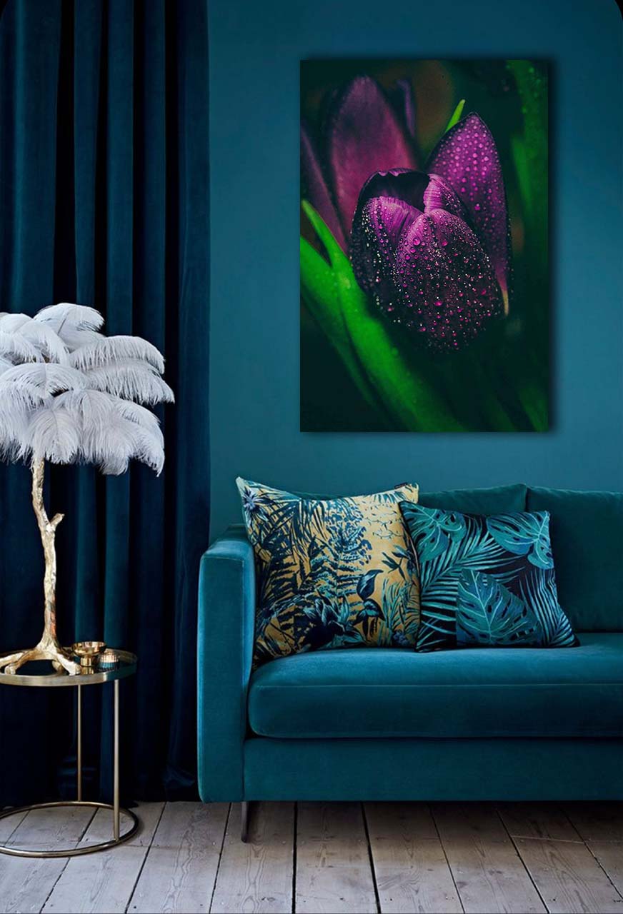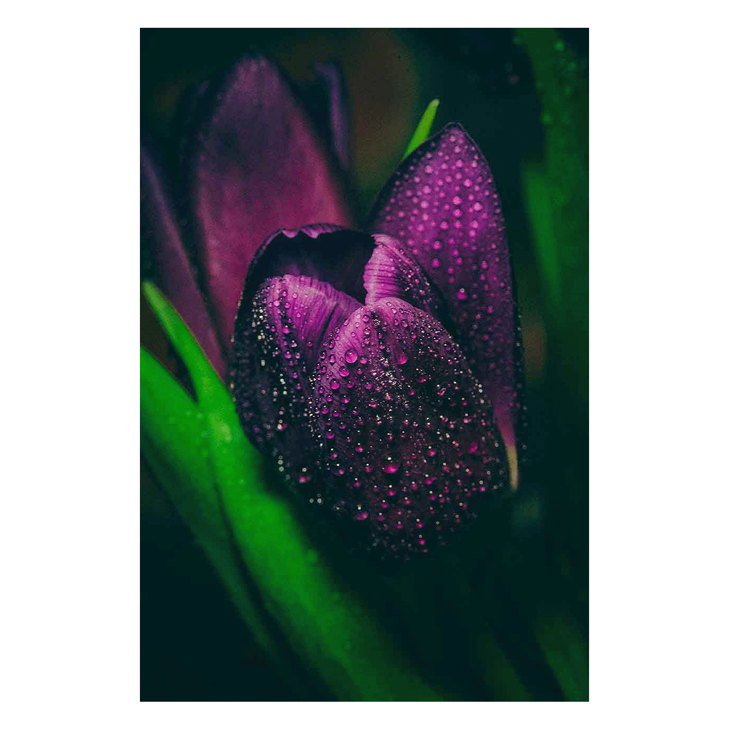 Das Wandbild Tulpe 1 auch Mystische Tulpe präsentiert eine faszinierende Darstellung einer kräftigen lila Tulpe mit lebendigen grünen Blättern, die vor einem tiefen, satten schwarzen Hintergrund hervorstechen. Die ausdrucksstarke Schönheit der Tulpe wird in diesem Kunstwerk in ihrer ganzen Pracht eingefangen, während der tiefe Kontrast zum Hintergrund eine einzigartige Intensität schafft.